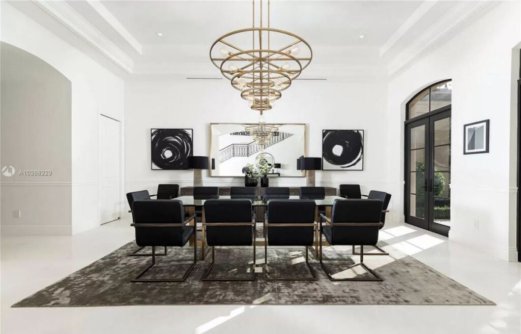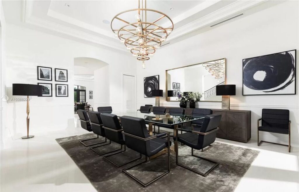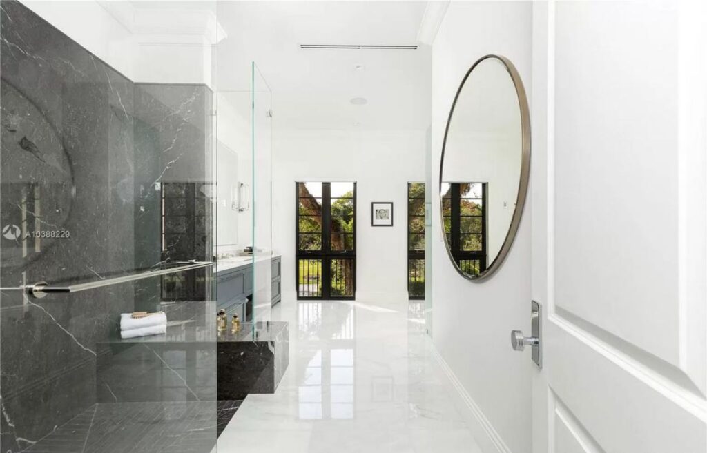 Text by the Agent: The Coral Gables Home for sale set perfectly on a 50,000 square feet waterfront lot in prestigious and gated Gables Estates, this 2017 classic Palladian home offers the perfect backdrop for either lavish entertaining or cozy family affairs.In the 12,839 square feet home, one finds a theater, large family room, gourmet cook’s, eat-in kitchen, and master suite with his and her lavish baths and dressing room closets; 4 car garage, covered terraces with a cabana, summer kitchen and sparkling, oversized pool, serve as the centerpiece of the rolling back lawn.