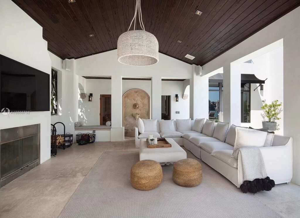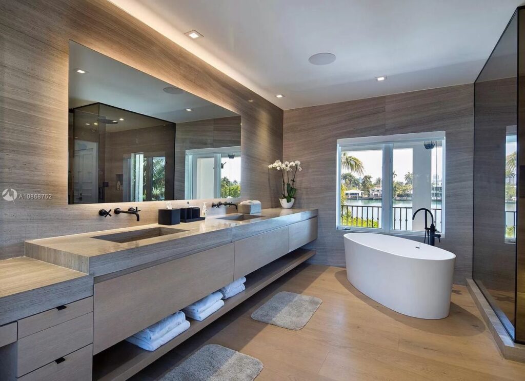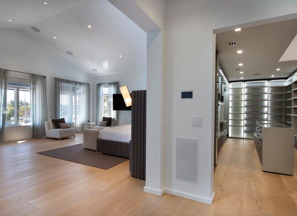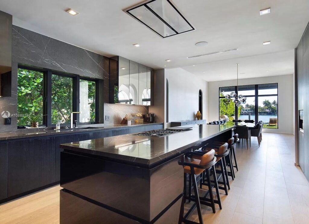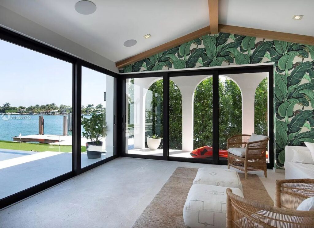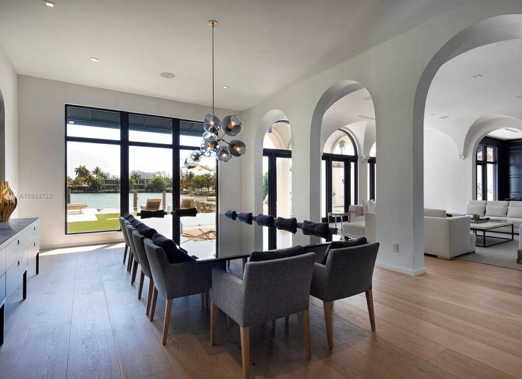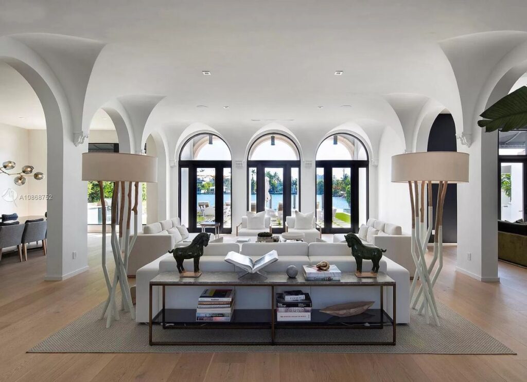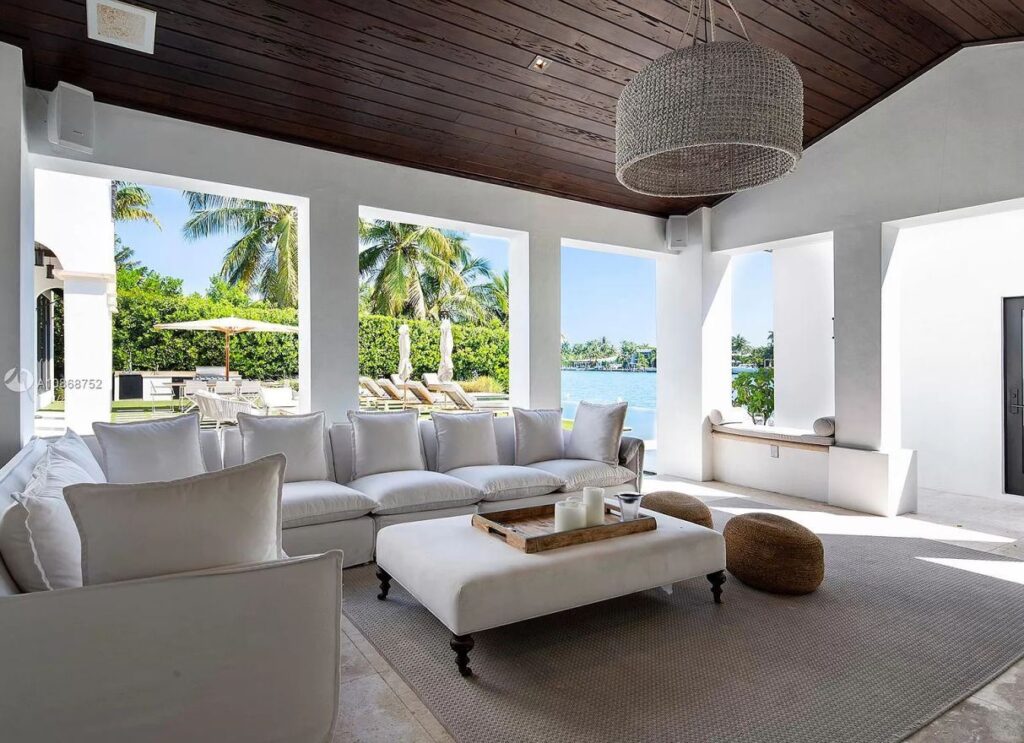 This striking Modern Italian Villa inspired home offers 100 feet of waterfront was designed by renowned architect Peter Hawrylewicz. Amenities include an exquisite chef’s kitchen, a spacious master suite walk-in closet, a private terrace with its own scenic water vista, an outdoor pavilion with a television and fireplace, steam room, sauna, pool house, and much more. This home’s stunning open-floor plan, elevated ceilings, and breathtakingly arched windows welcome an abundance of light into every room. Recently completely renovated with modern transitional style with high end Italian and Brazilian furniture.