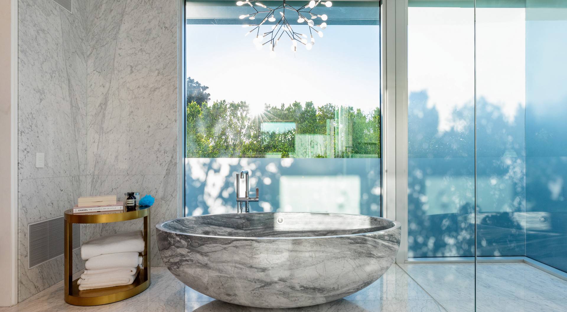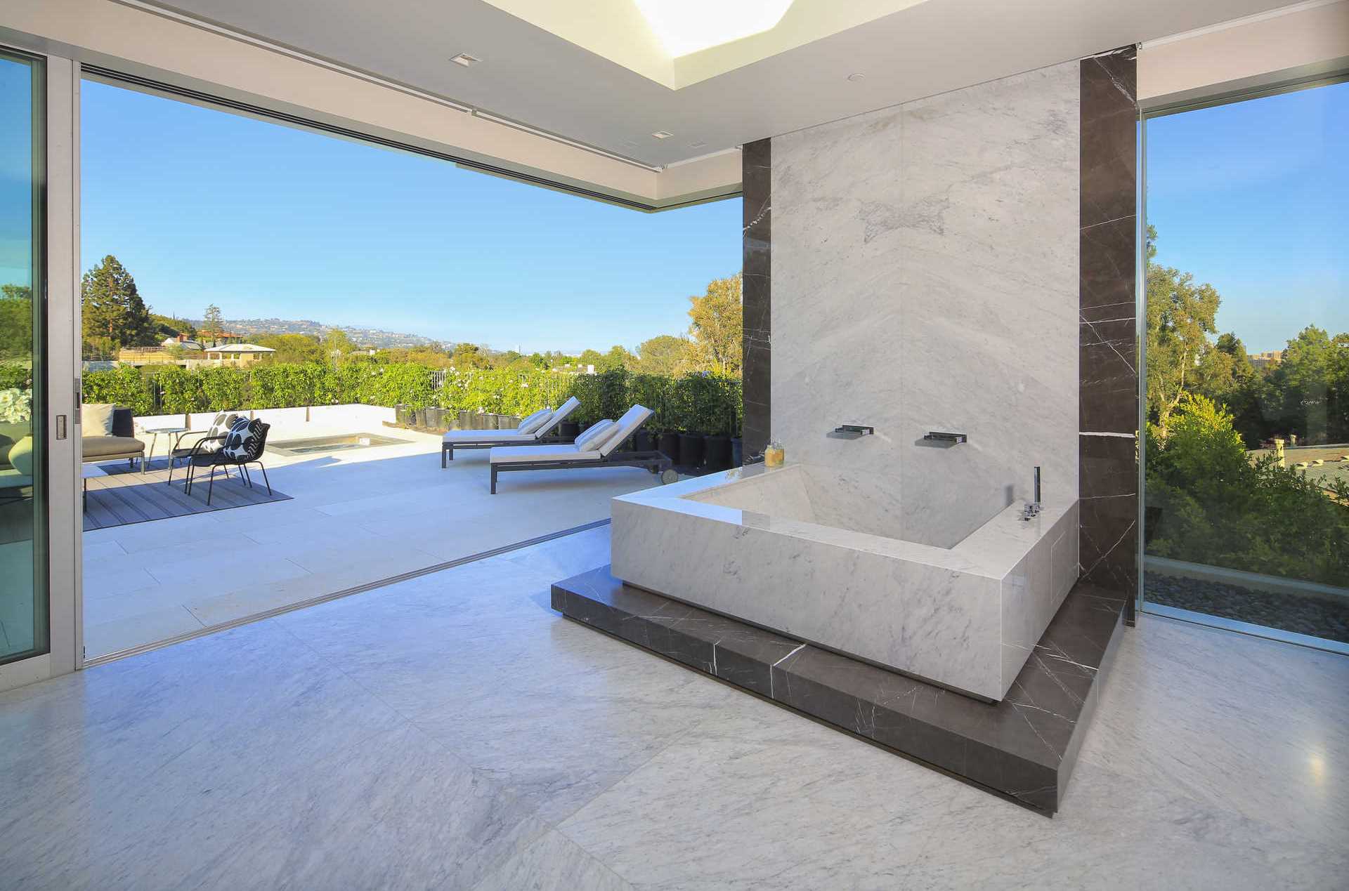 18 | From the design to the faucet, this modern and large bathroom features a stone bathtub with a modern design. Perugia Way Architectural Masterpiece in Prime Lower Bel Air, California