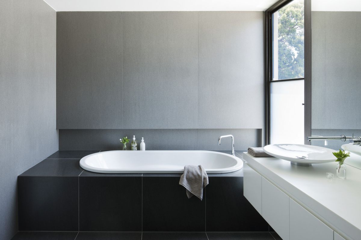 19 | The combination of a white porcelain bathtub, black stone shelves, and gray walls creates a modern and simple space that is also extremely comfortable. Elegant Malvern House in Australia by Canny Design