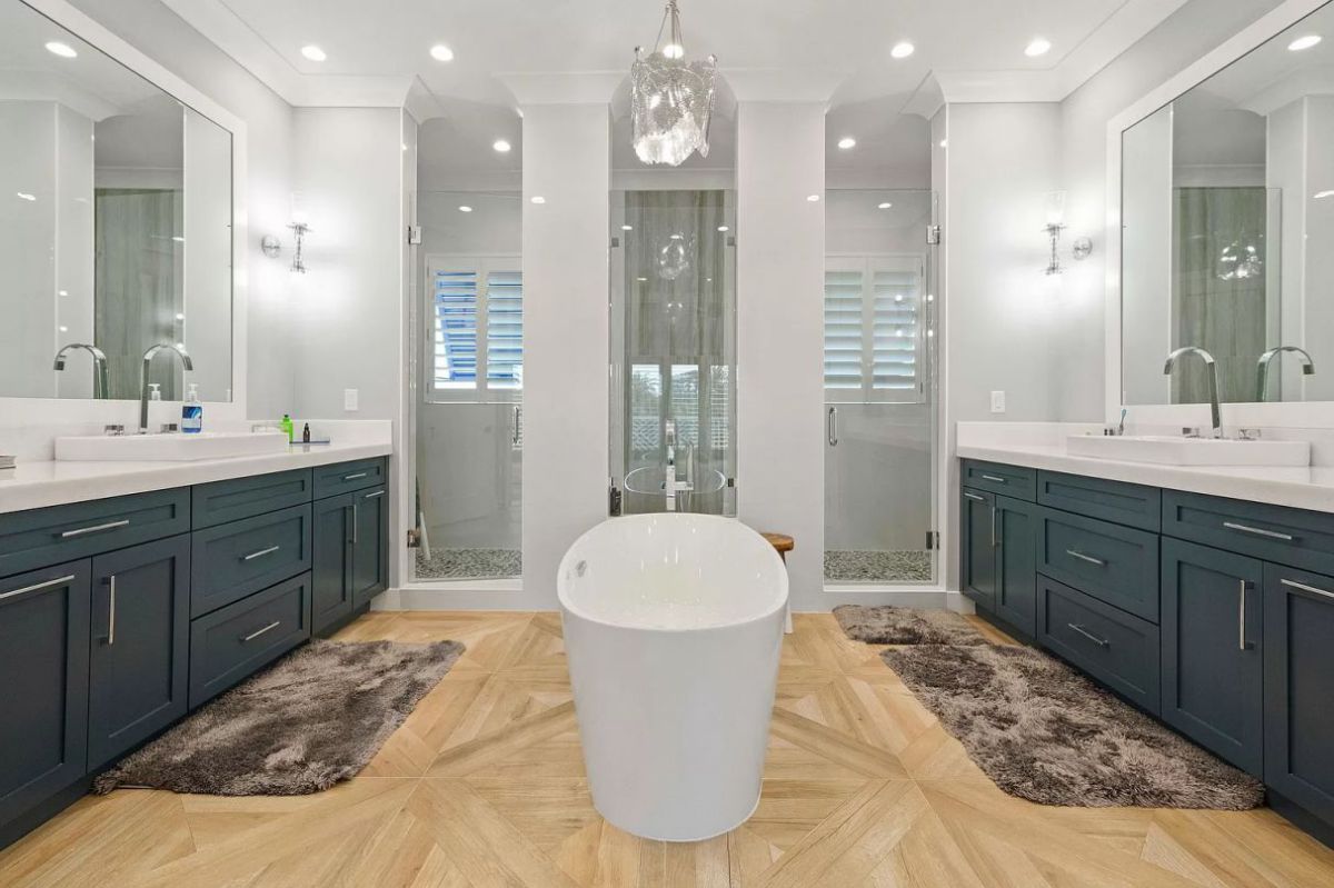 1 | Modern bathroom with step-in bathtub and wall tiles that complement each other, creating a relaxing environment. Florida Transitional House on Tahiti Beach Island Asks for $13.9 Million