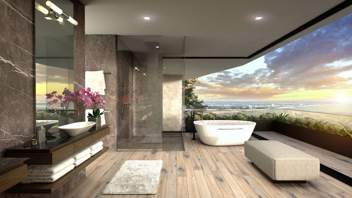 5 | A luxurious bathroom with a simple white porcelain bathtub, ideal for relaxing with a panoramic view. Malibu Modern Home Design Concept by CLR Design Group