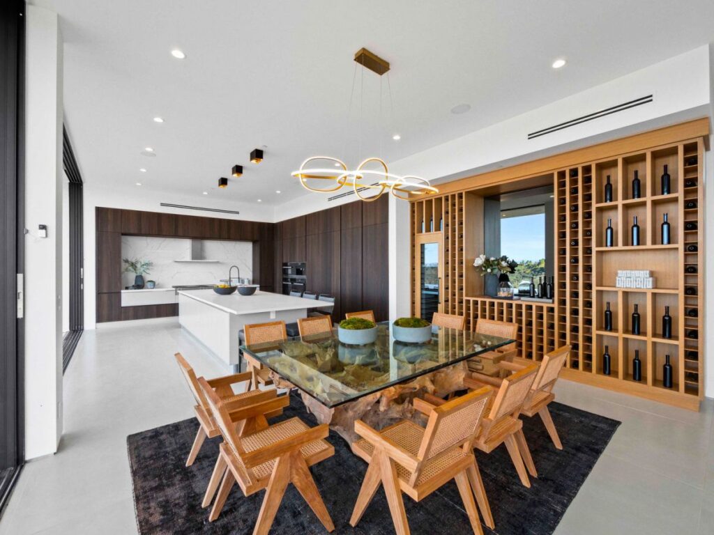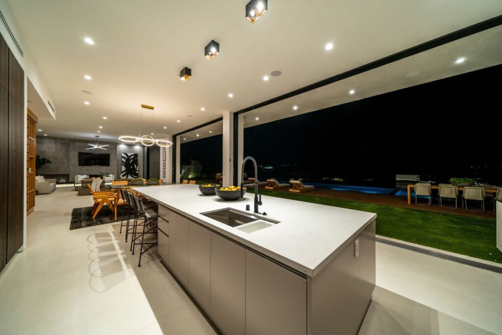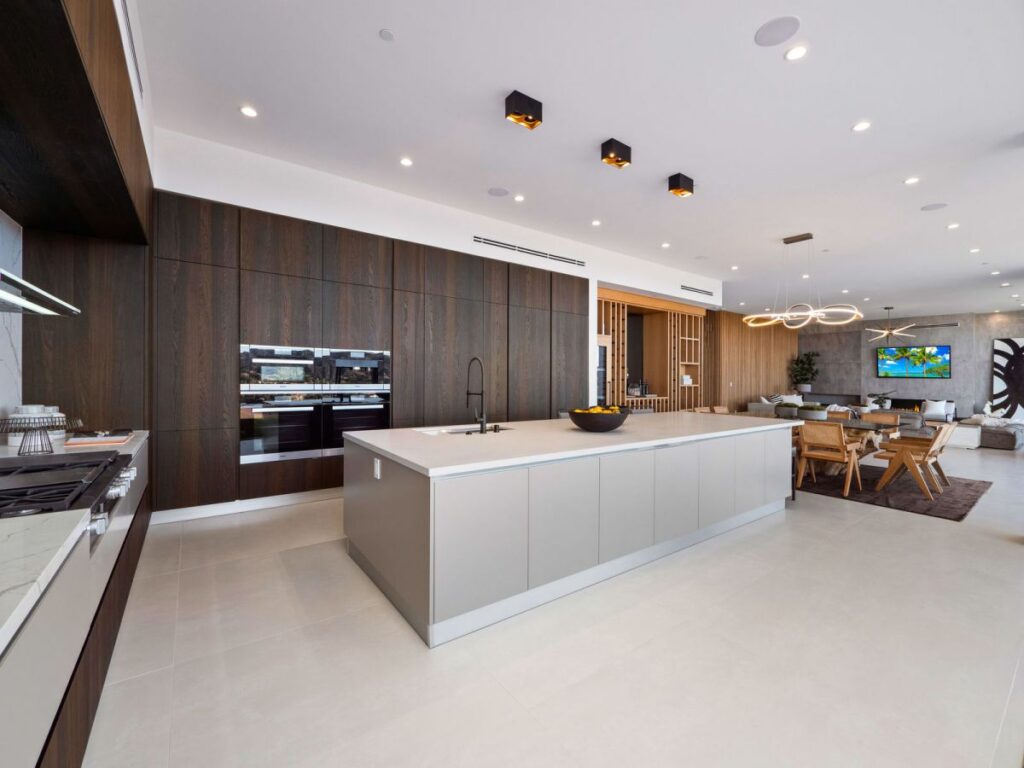 Open-plan living and dining areas include a custom wine display and Italian chefs kitchen with Miele appliances, quartz countertops and walk-in pantry. 12 Fleetwood pocket doors open to the 55 infinity pool, fire pit and expansive terraces with jetliner views. 5 bedrooms include the exceptional master with terrace, walk-in dressing room and spa-style bath with tub and shower floating over the canyon. Melding masterful design and thoughtful amenities, the home boasts a rooftop terrace with fire pits and BBQ, home theater, office, 2nd-floor family room, Control4 Smart Home system and 2-car garage.