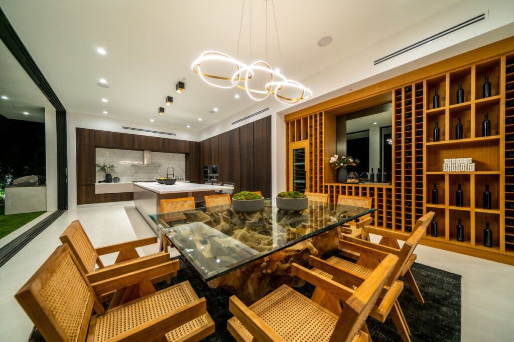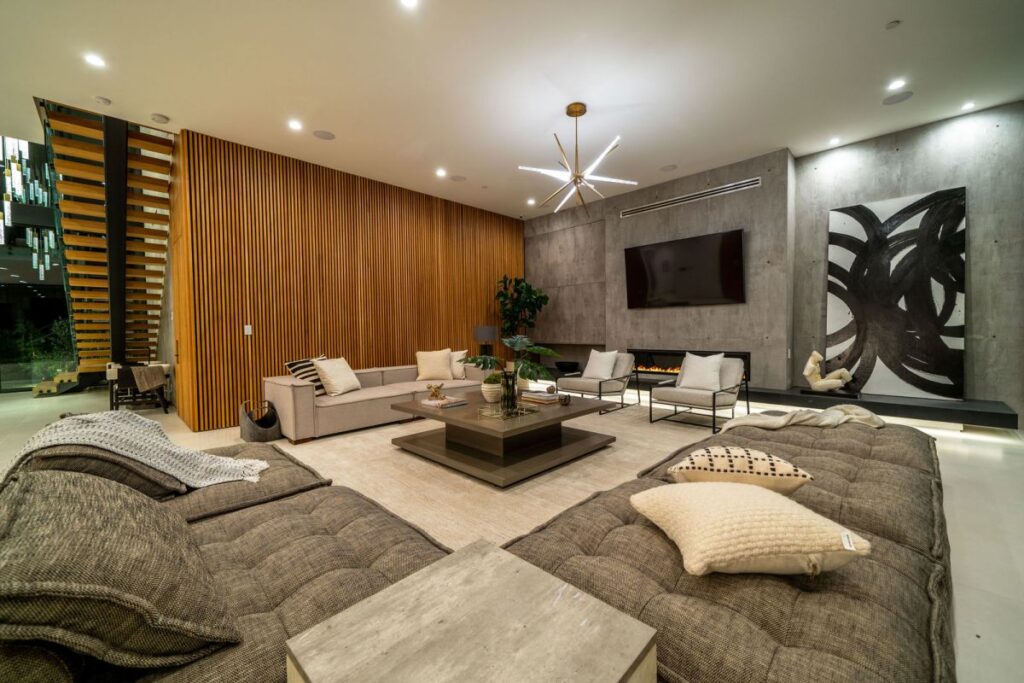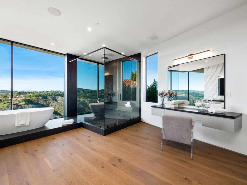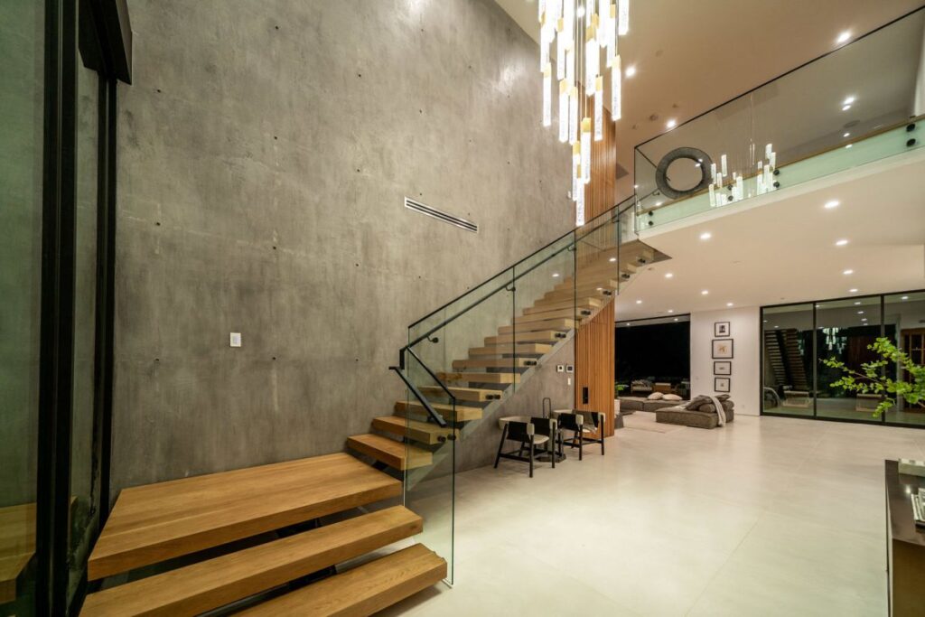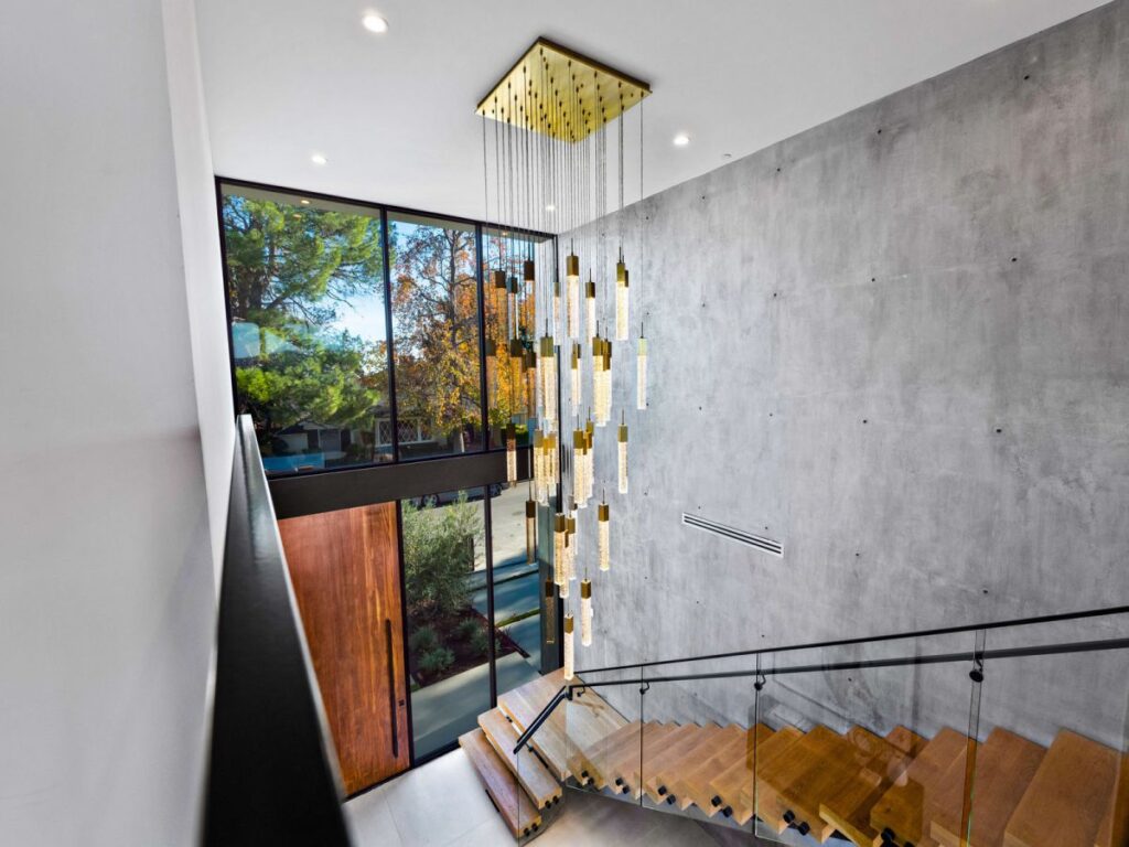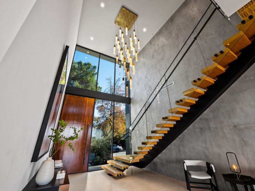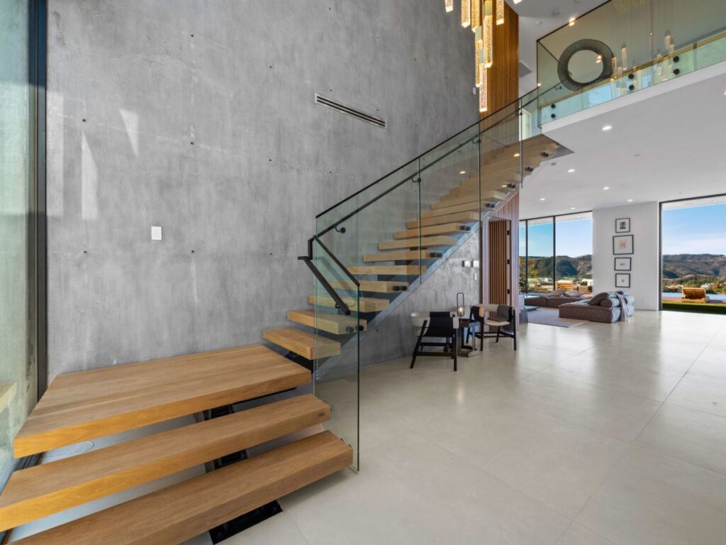 Text by the Agent: This home for sale is a stunning, contemporary new architectural captures panoramic canyon and mountain views from its hillside perch in Bel Air. Envisioned to reflect the natural surroundings, the 6,550-sq-ft home showcases an exquisite mix of glass, stone and wood, maximizing views from every room. Arrive to the magnificent entry hall with double-height ceilings and suspended wood and glass staircase.