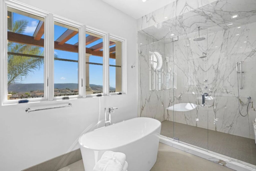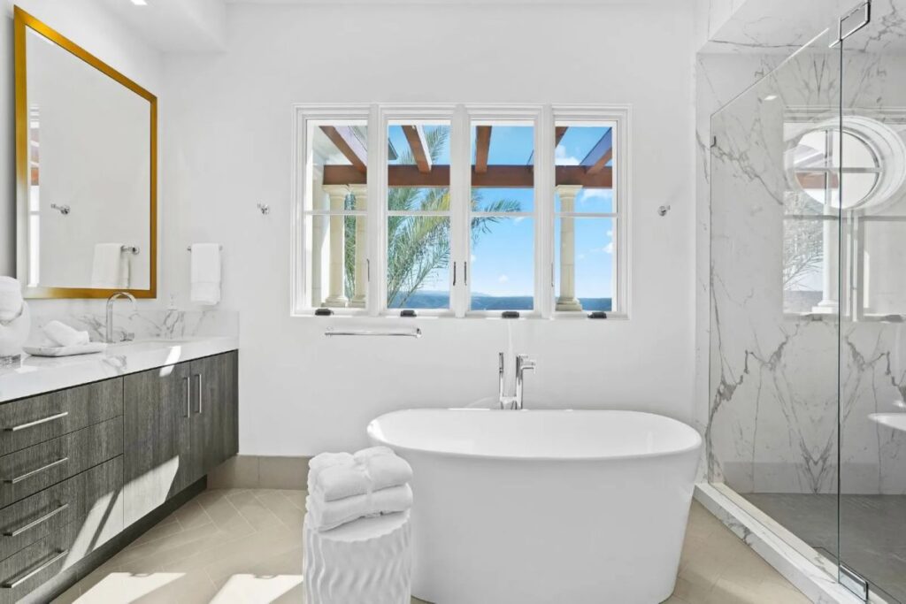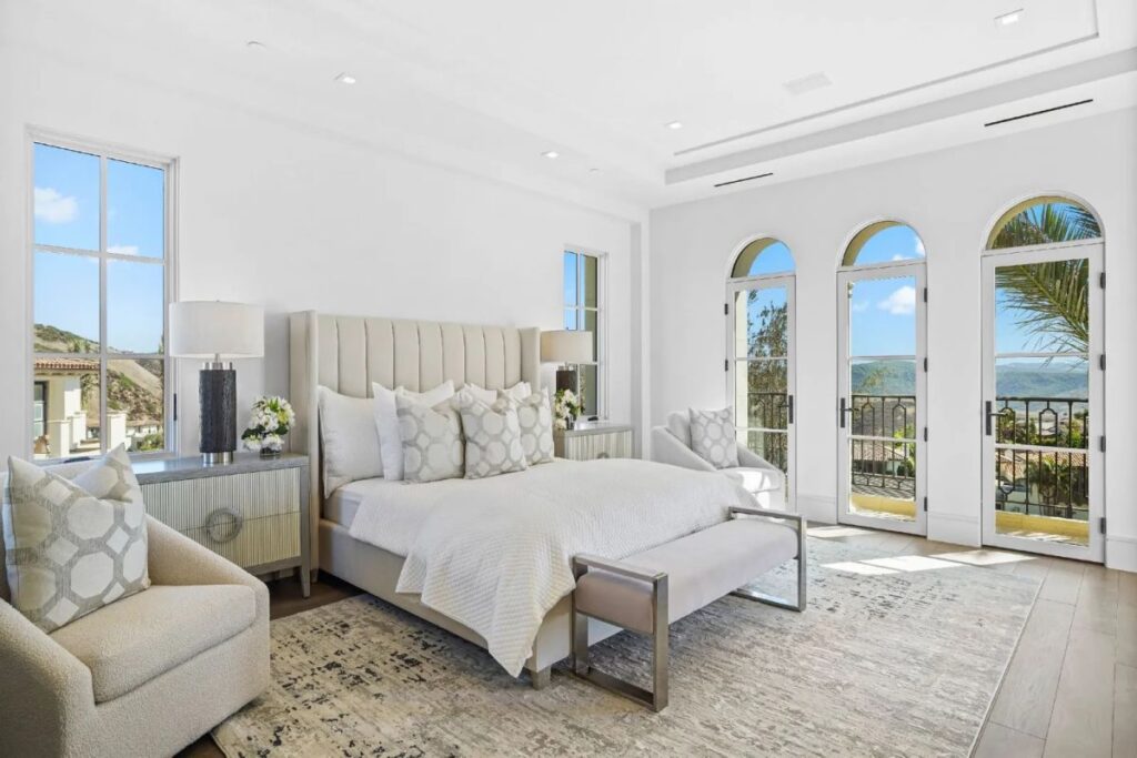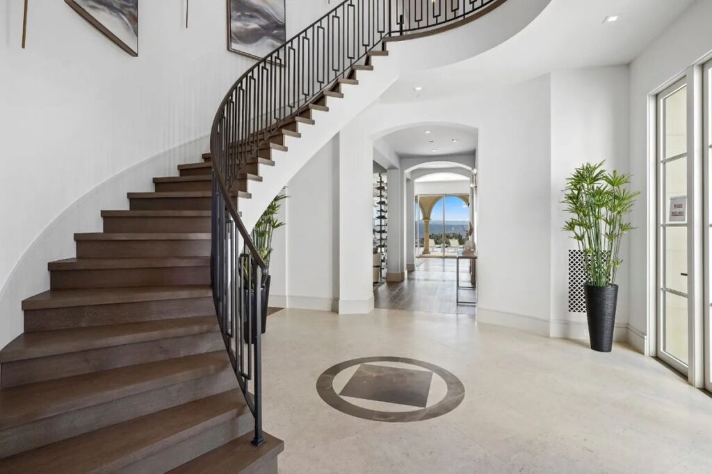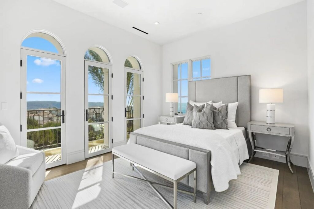 Text by the Agent: A brand new custom estate in Crystal Cove has just been completed. This home for sale is the pinnacle of soft contemporary design and luxury at the top of this ultra-exclusive, guard-gated enclave, on a large 18,000 square feet lot with expansive ocean and hillside views. This 6,200 square feet, 5 bedroom, 6 bath residence with a rare 30′ building height allowance is chic, yet timeless. Interiors are beautifully transitional in style, with rift white oak flooring, light porcelain and stone, disappearing walls of glass + large windows to bring the views inside, all providing a sun-washed ambiance.