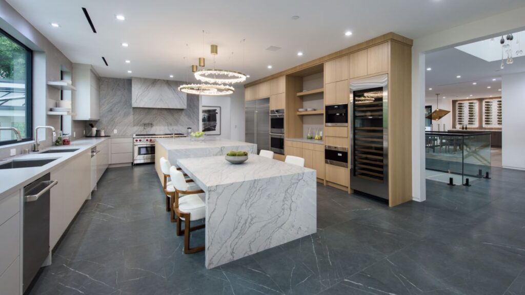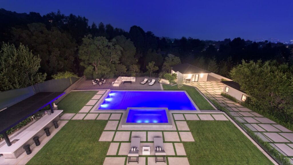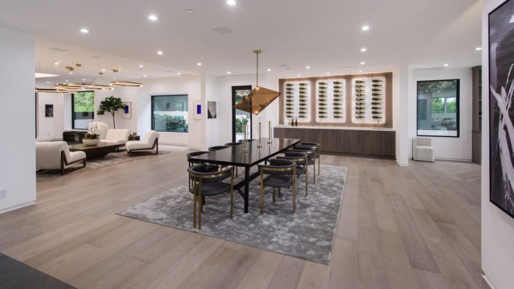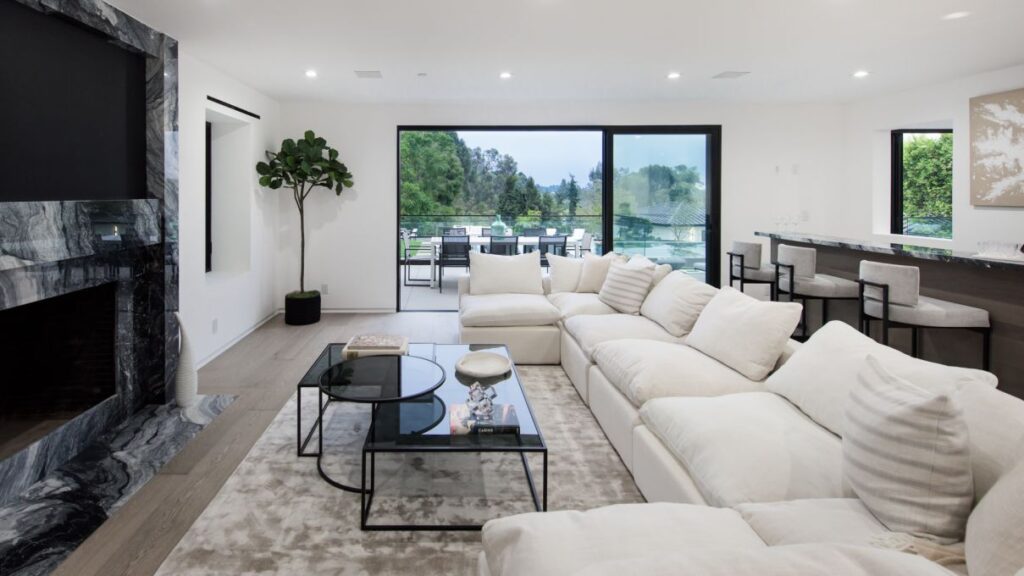 Text by the Agent: This Los Angeles Home for Sale set on nearly an acre in Brentwood, the 3 story gated home has every state-of-the-art amenity imaginable. The perfect balance of formal entertaining space offset by casual high-end living spaces. Accommodations include 7 bedrooms, 12 bathrooms, formal dining room, several living rooms, multiple bars, a theatre room, game room, gym and office. Professional chefs’ kitchen with rift white oak cabinets, top of the line appliances and a beautiful, tiered stone waterfall island.