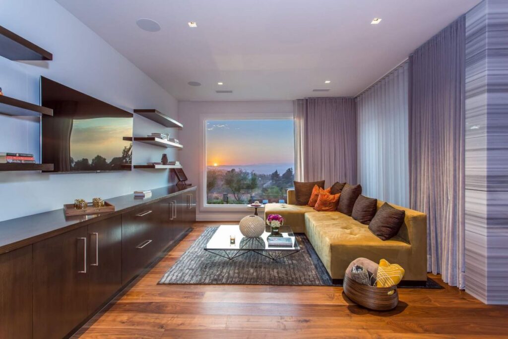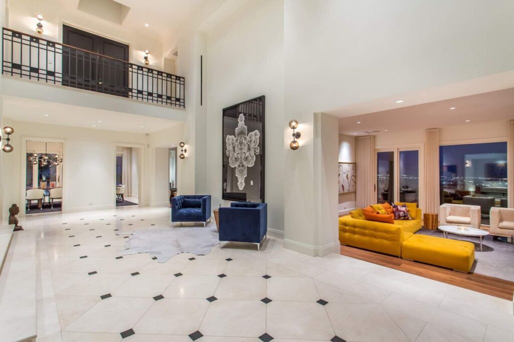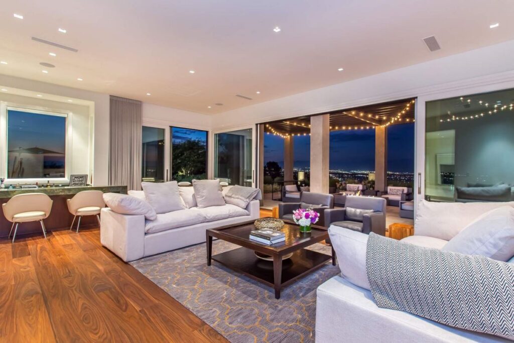 Text by the Agent: Impeccable Exclusive Listing Inside the luxurious gated community, The Summit. The House for sale centered at the heart of Beverly Hills and surrounded by three parks at the confluence of Mullholland Drive and Coldwater Canyon Drive. The enclave is favored by affluent members of society. This property has a chic grand entrance with a beautiful contemporary towering glass double door that opens to a fully tiled entryway. Greeted by a formal living room with modern hardwood floors that peeks at the grand landscaping views of the San Fernando Valley.