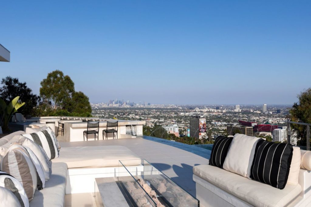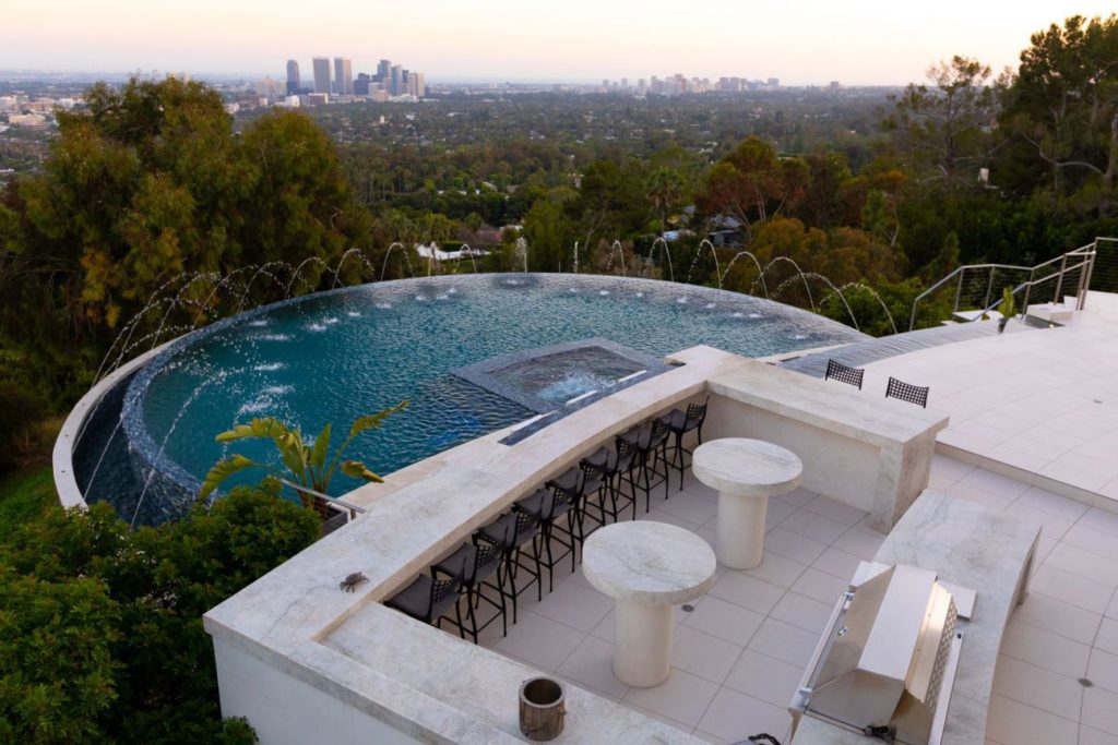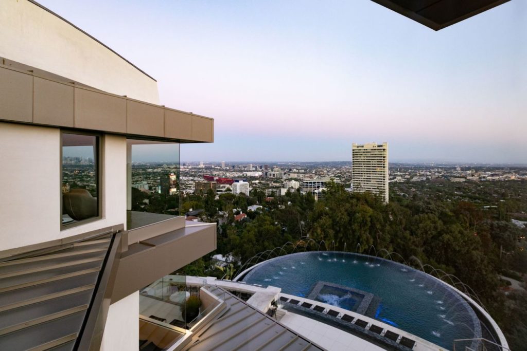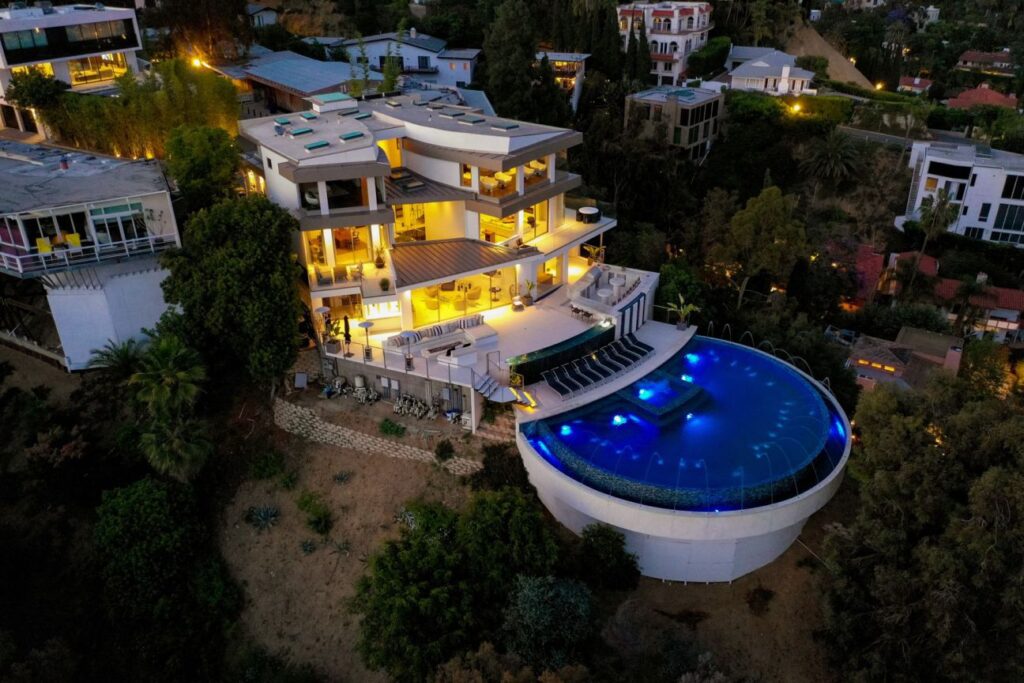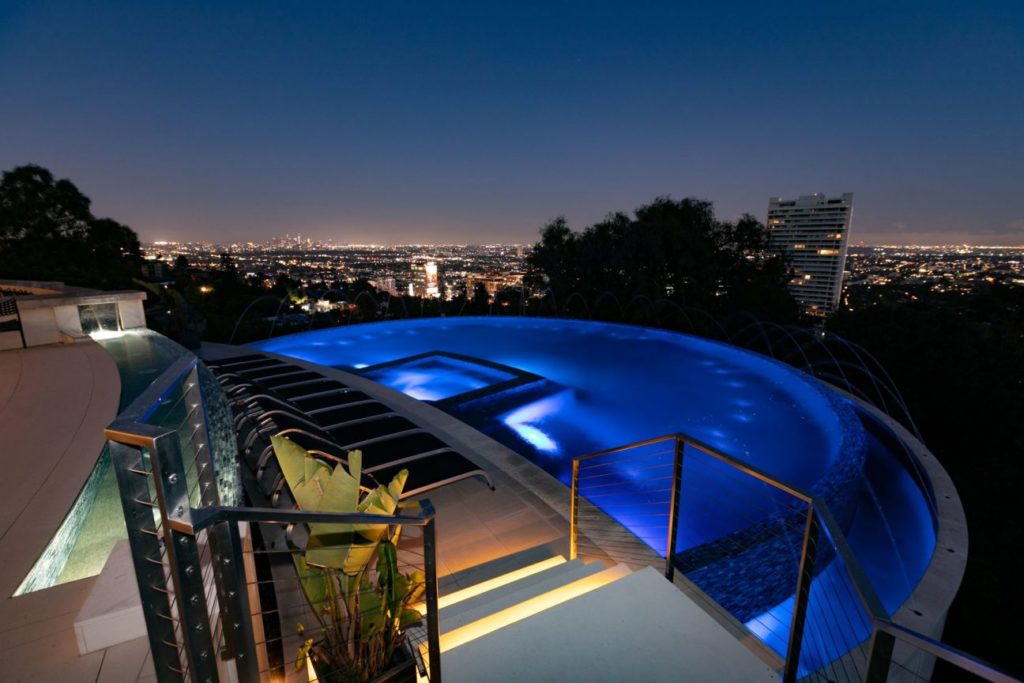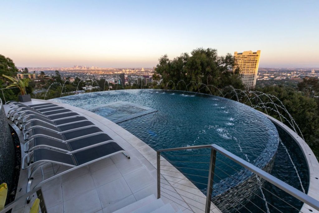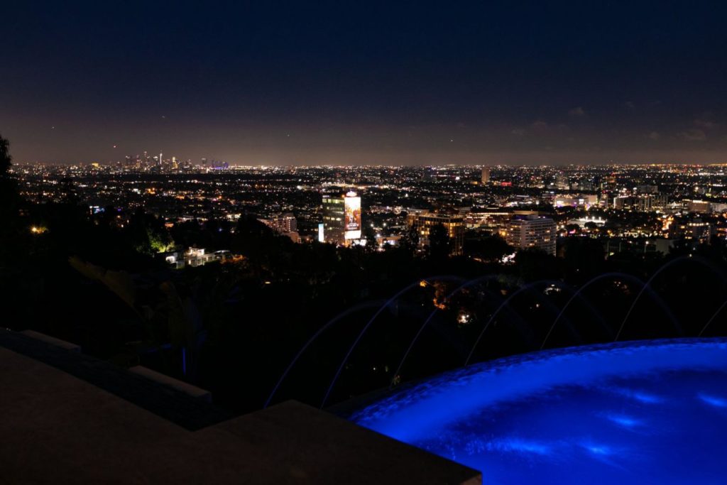 The Ultimate Trophy Compound in Los Angeles located on a quiet cul-de-sac backed on the market for $16,495,000. The previous listing on 21 July 2017, this house offered 19,750,000 by Sotheby’s International Realty. This extraordinary mansion offers sweeping views from DTLA to the ocean. American walnut flooring throughout 5 bedrooms, 6 baths, a theater and gym. Spacious master with skylights, large closets and separate handbag and shoe rooms. Dining area includes Tiffany dining table and Delfin swivel chairs. Home theater with seating for 10 features plush reclining sofas, LED lighting and home automation. The outdoor space hosts an 1800 square feet. infinity pool, 8 feet fire pit and alfresco dining areas and more. Ultimate Trophy Compound in Los Angeles.