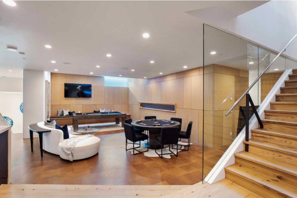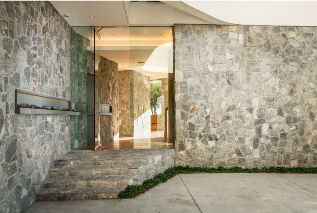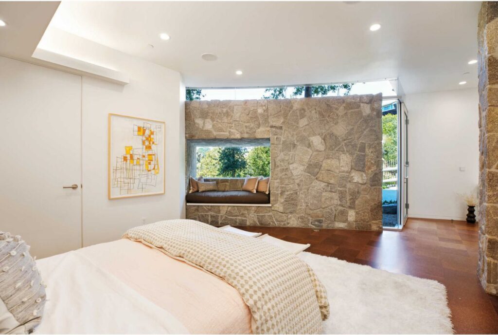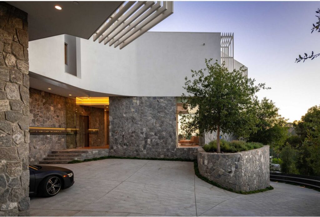 Text by the Agent: The Beverly Hills House situated on a private promontory in Beverly Crest, this contemporary new architectural is nestled into the hillside capturing sweeping canyon, city and ocean views. Envisioned by architect Ivan Ivanov, the approx. 9,312 square feet home boasts hand-laid stone walls, 12 ceilings, oak floors from reclaimed 19th-century barn and modern chef’s kitchen with Thermador appliances. Floor-to-ceiling glass walls connect indoor-outdoor living, opening to the infinity-edged pool with windows to the gym below. Expansive terraces boast a built-in BBQ and olive tree, among the 50 new trees planted onsite. 5 bedroom suites include 2 upper-level masters, both with a spacious soaking tub. The lower entertainers level features a stunning bar, 3,000-bottle wine cellar, gym and theater. Features include a Zen-inspired backyard with redwood hot tub and yoga deck, Carrera marble baths, elevator, KNX smart system and 2-car garage. This spectacular, private contemporary house is located moments from downtown Beverly Hills.