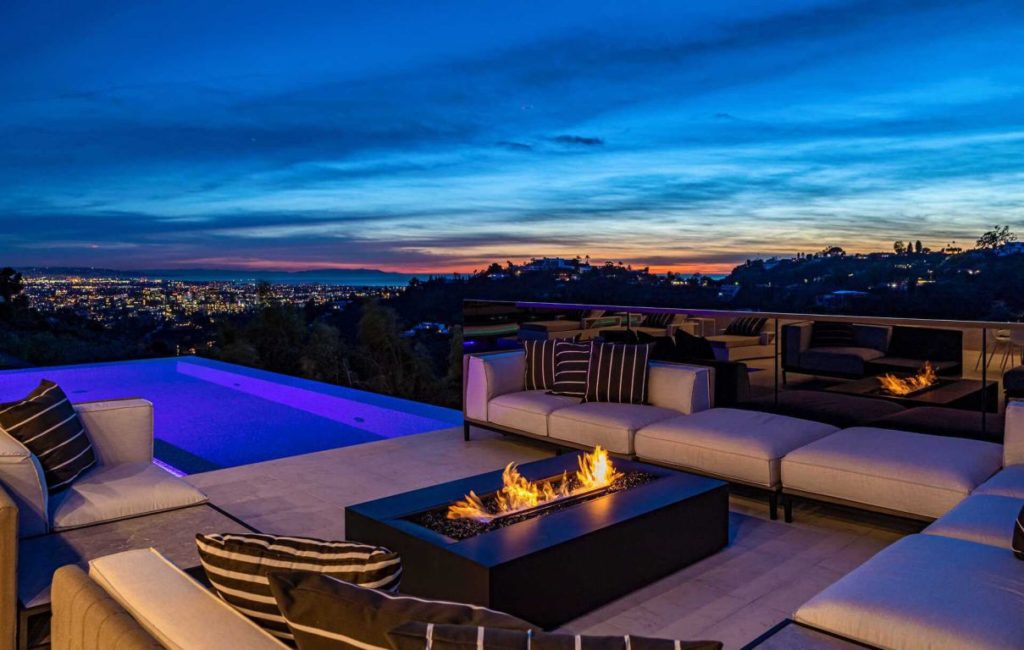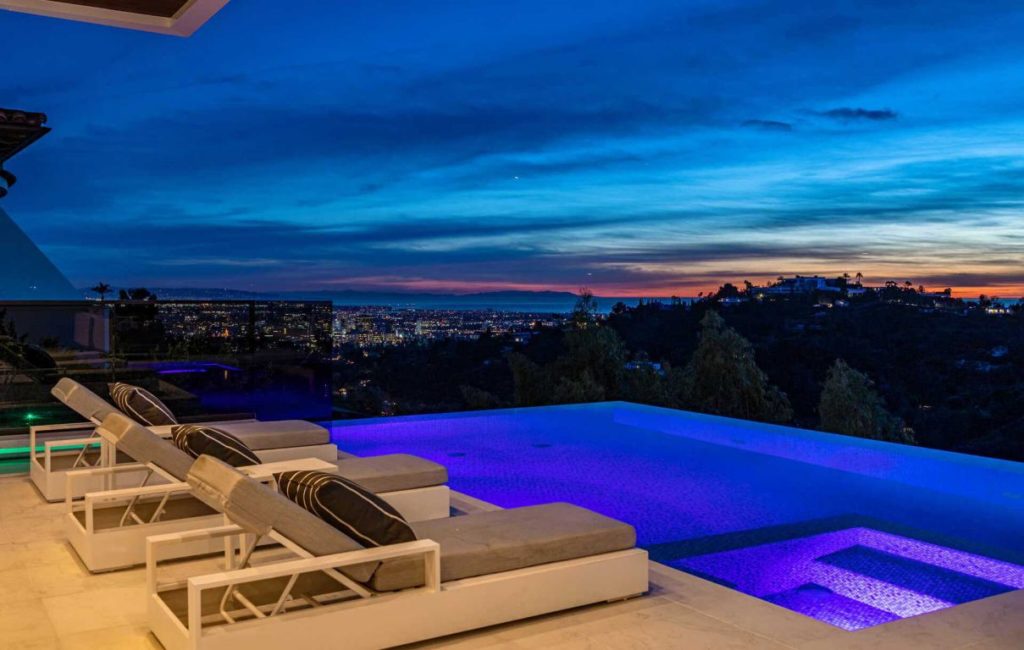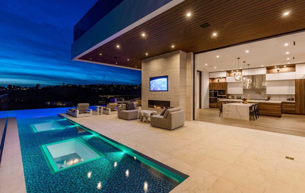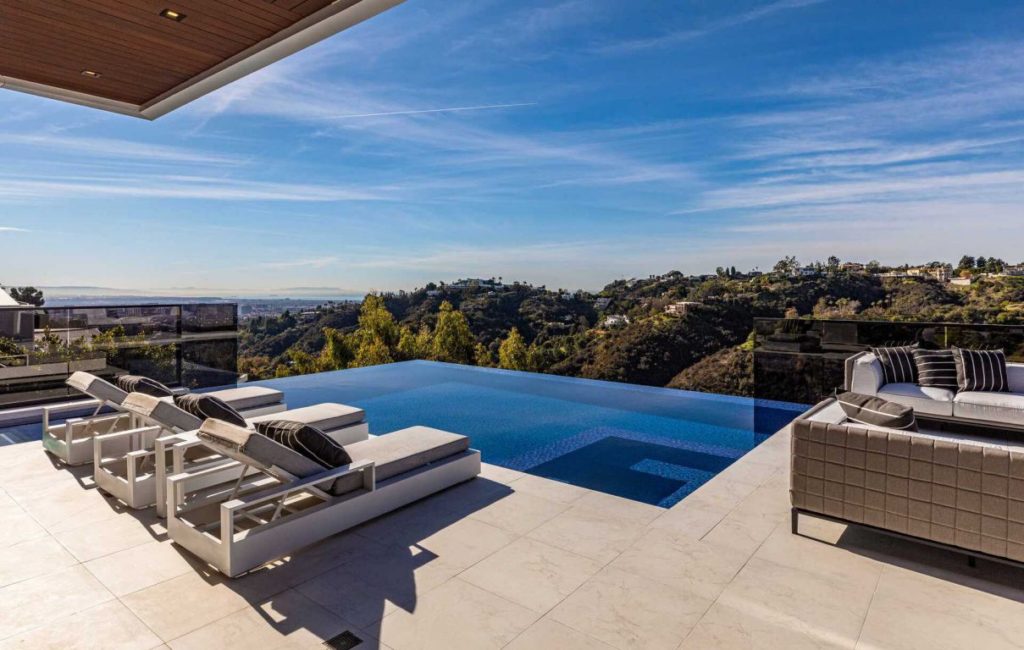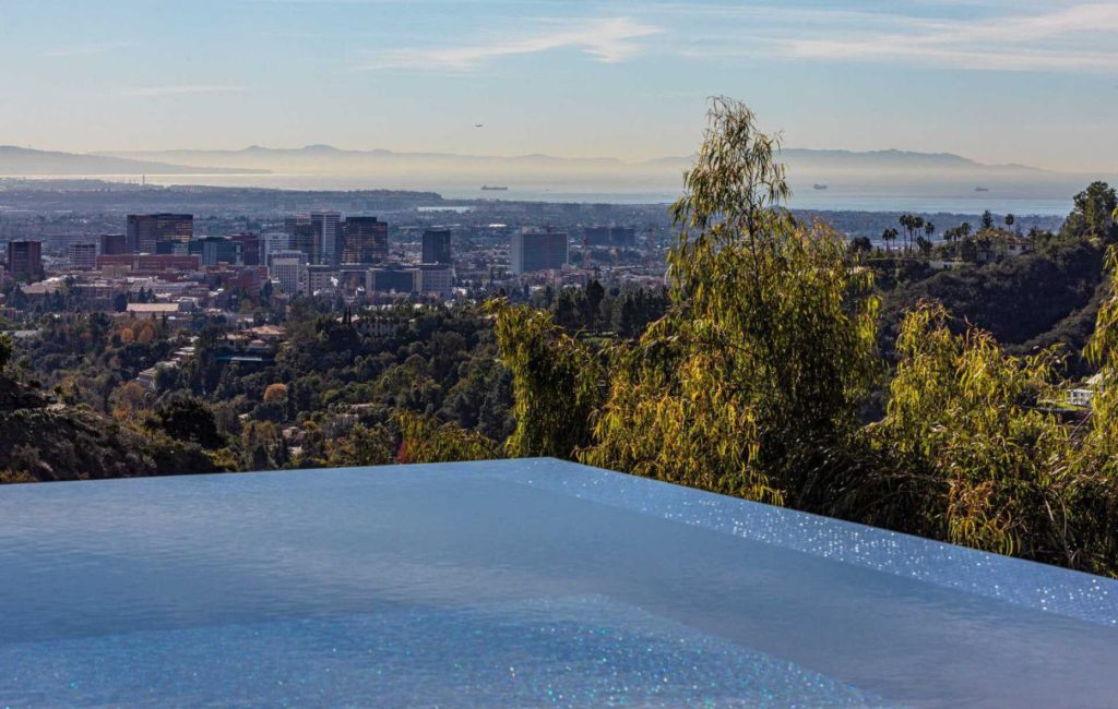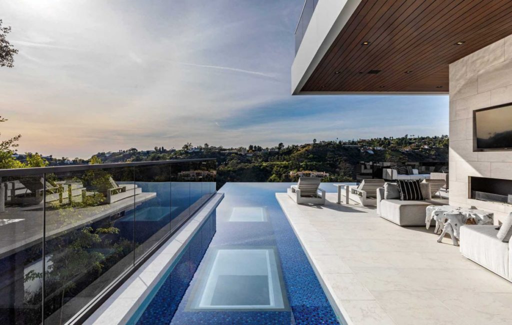 Brand New Modern Bel Air Masterpiece set on atop a popular area in Bel Air with sweeping views of the city and ocean in this contemporary masterpiece with 6 bedrooms and 9 bathrooms. This luxurious masterpiece is perfect for entertainment, as each living space focuses on incredible views and flows straight to the outdoors with the pocket door completely disappearing. Gourmet kitchen has an oversized island with seating for 12 and top of the line appliances. The 3-storey house boasts a theater, gym, 900 gallon aquarium, 1,000-bottle wine cellar and butler’s pantry, as well as a spacious rooftop with its own bar and fire pit. The master suite has a prominent fireplace and another disappearing set of doors that open up to a private yard and impressive views. A splash infinity pool at the main level creates a waterfall that casts down to the lower floor and makes the exterior truly stunning.