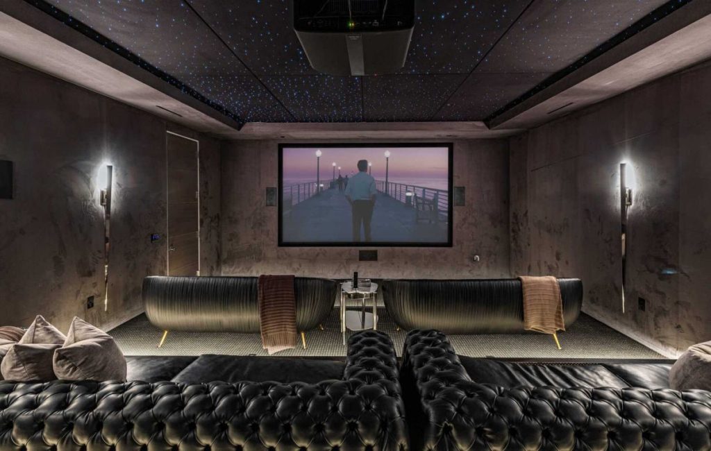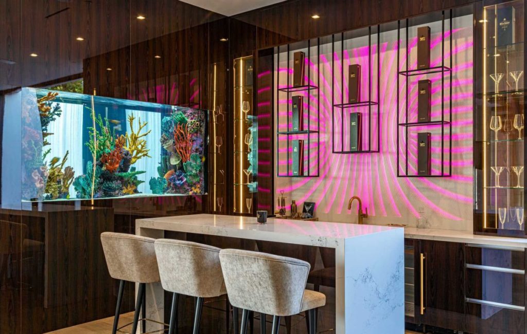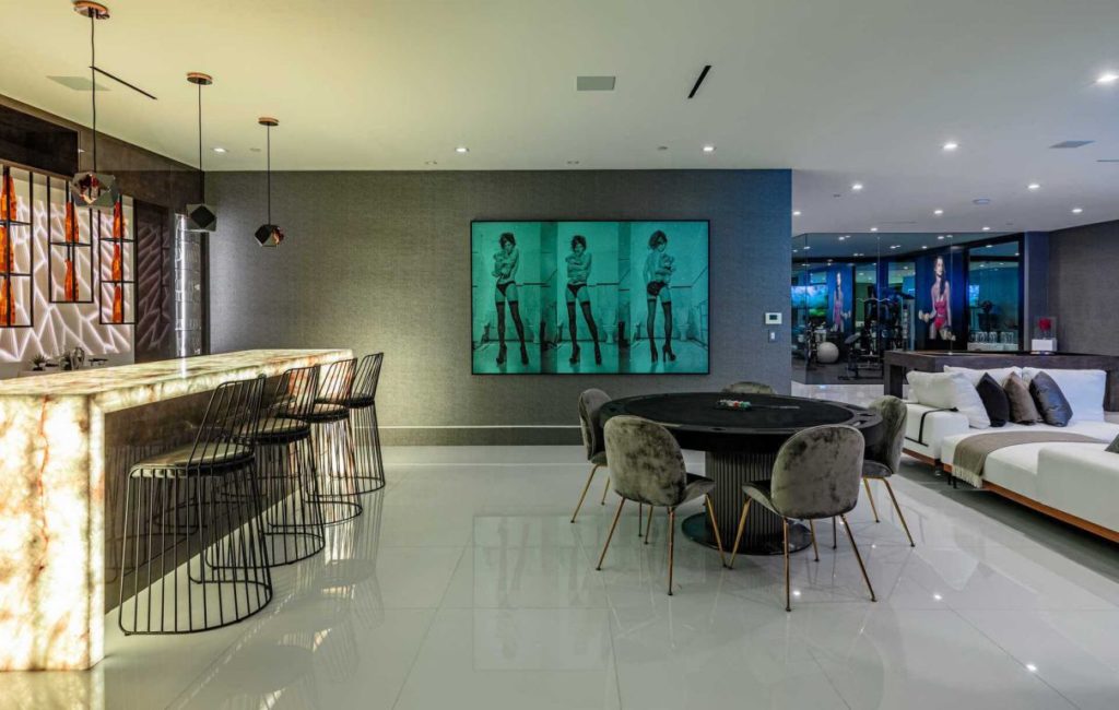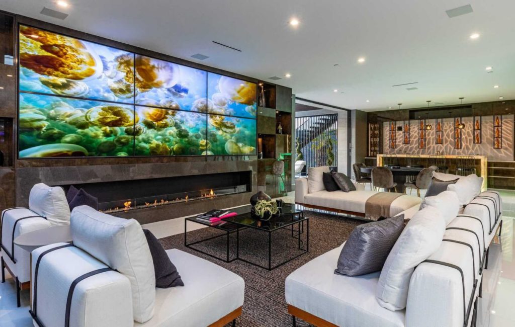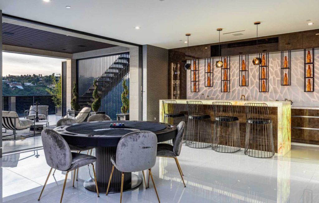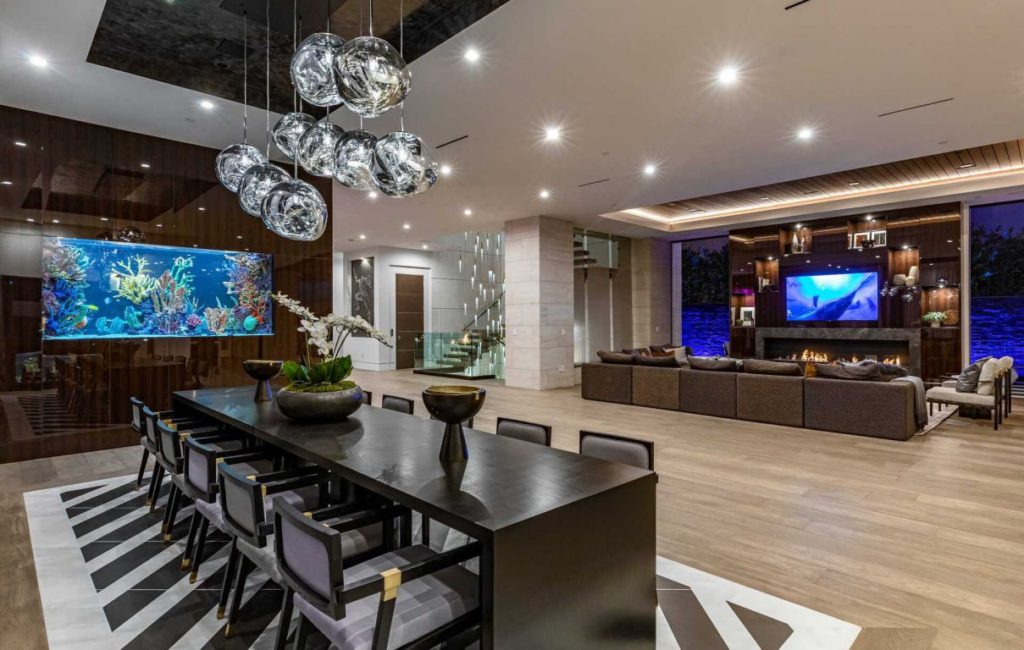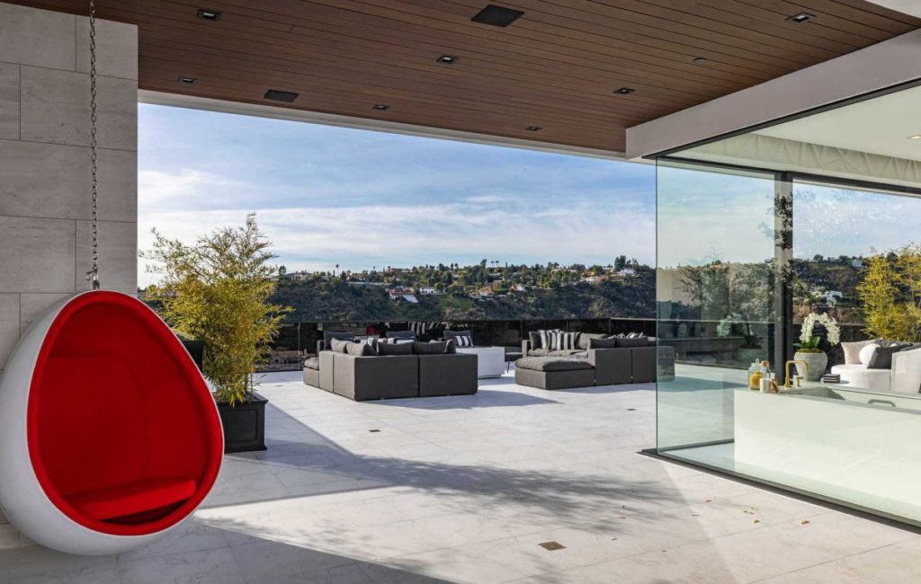 Brand New Modern Bel Air Masterpiece set on atop a popular area in Bel Air with sweeping views of the city and ocean in this contemporary masterpiece with 6 bedrooms and 9 bathrooms. This luxurious masterpiece is perfect for entertainment, as each living space focuses on incredible views and flows straight to the outdoors with the pocket door completely disappearing. Gourmet kitchen has an oversized island with seating for 12 and top of the line appliances. The 3-storey house boasts a theater, gym, 900 gallon aquarium, 1,000-bottle wine cellar and butler’s pantry, as well as a spacious rooftop with its own bar and fire pit. The master suite has a prominent fireplace and another disappearing set of doors that open up to a private yard and impressive views. A splash infinity pool at the main level creates a waterfall that casts down to the lower floor and makes the exterior truly stunning.