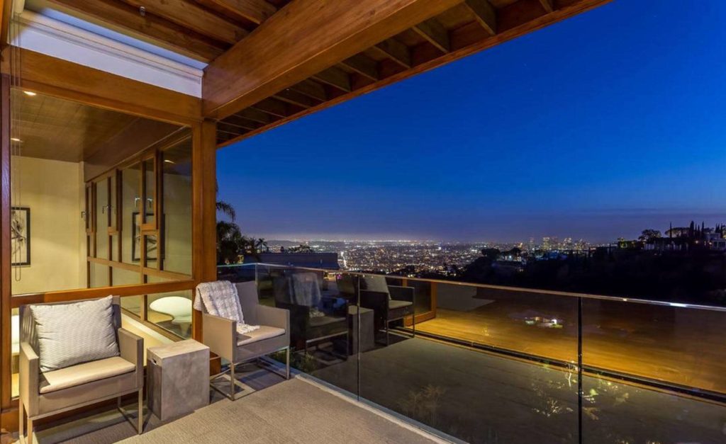 Los Angeles Modern Home located at the end of a cul de sac behind private gates; sits this approximately half acre celebrity compound with breathtaking city lights to expansive ocean views. Experience a warm architectural masterpiece with soaring ceilings throughout; chic open floorplan that infuses rich organic woods; disappearing glass doors leading out to park like grounds featuring a varietal of organic fruit trees; and 60′ salt water infinity pool and spa. Outstanding features include state of the art chef’s kitchen; large private master suite with spacious walk in closet; brand new modern glass staircase; 12 seat home theater; game room with wet bar; maids’ quarters and private parking for up to 8 cars within the gated estate. Breathtaking city lights Viewsite Drive Modern Home in Los Angeles.