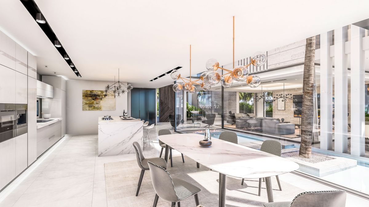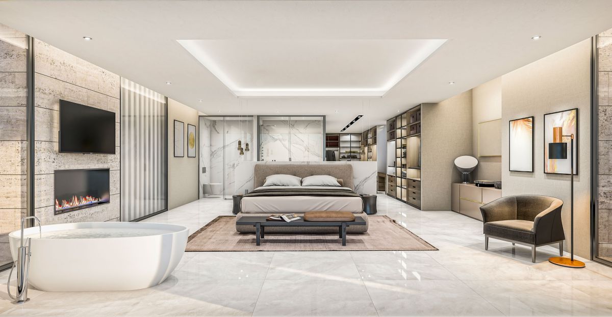 The project distributed in 4 levels; which consists 7 master bedrooms with a dressing room in all of them. The first floor dedicates for the family bedrooms. The ground floor divides in two parts by double height access hall with the palm in the villas heart; leaving aside a large living room of more than 80m2 at the one side, and another side having open plan kitchen and dining room.