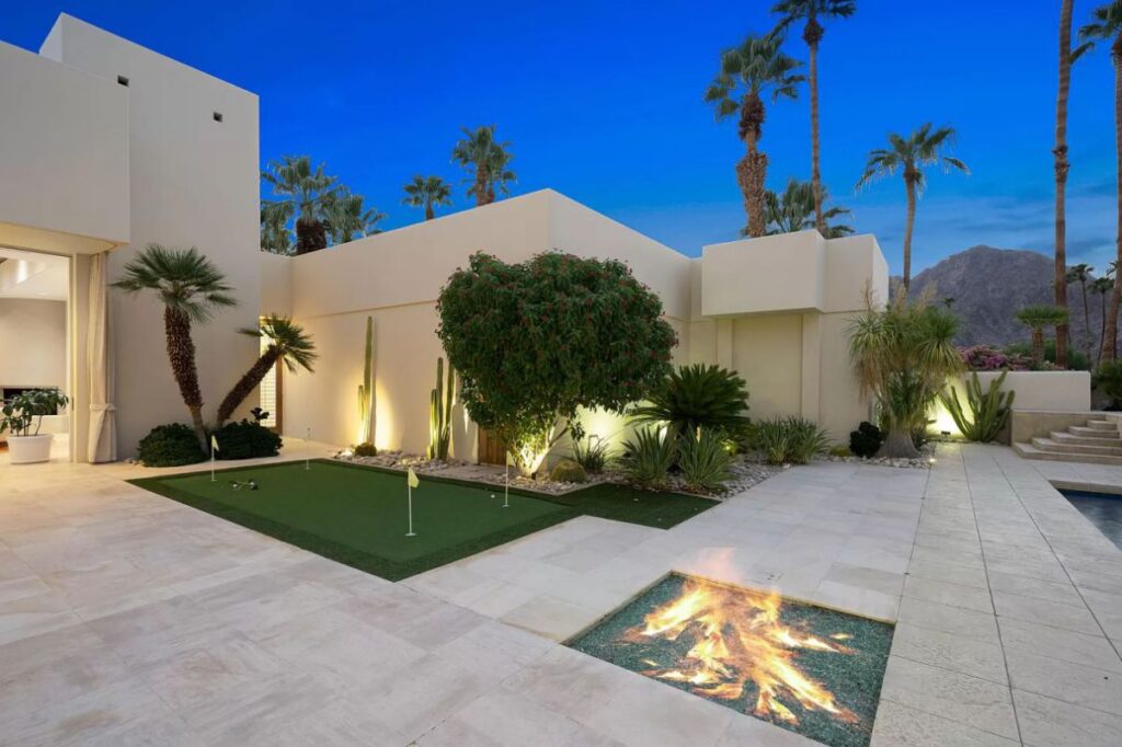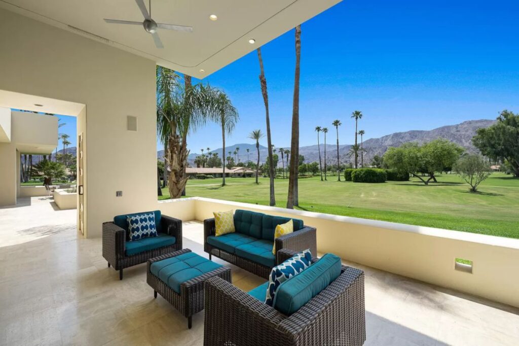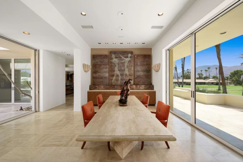 Text by the Agent: The Home for Sale in this alluring compound set on 1/2+ acre with panoramic views of the Santa Rosa mountains and the lush fairways of the famed La Quinta CC. The dramatic entry will take your breath away with a courtyard featuring a resort size pool, raised spa, putting green, glass in ground fireplace and outdoor BBQ kitchen. Designed with numerous walls of glass that pocket seamlessly. The living room boasts two fireplaces framing the massive sliders and the broad veranda. The formal dining room features a wall to wall art sculpture fountain.
