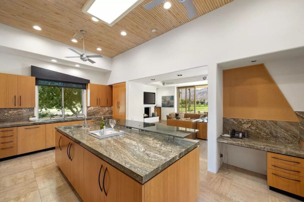 There is a casual and spacious family room off the kitchen with yet another fireplace. The deliberately planned kitchen has a large center dining island, 3 ovens, over sized 6 burner cook top, 2 warming draws, beverage refer, 2 refrigerators and a full sized Sub Zero freezer in the butler pantry. A truly Dramatic Home for Sale in La Quinta.