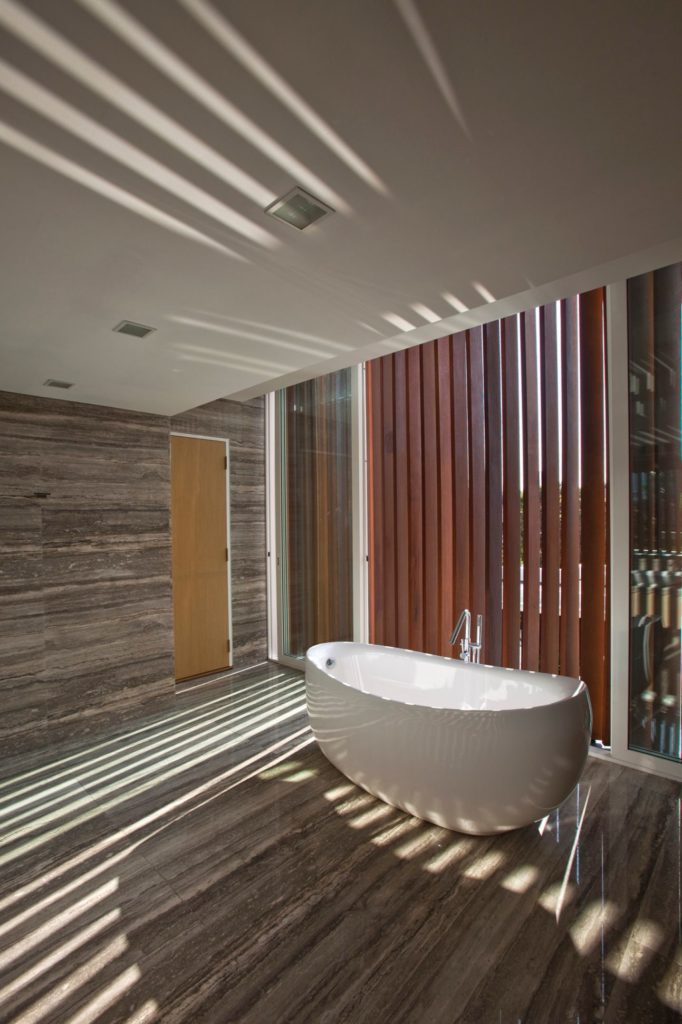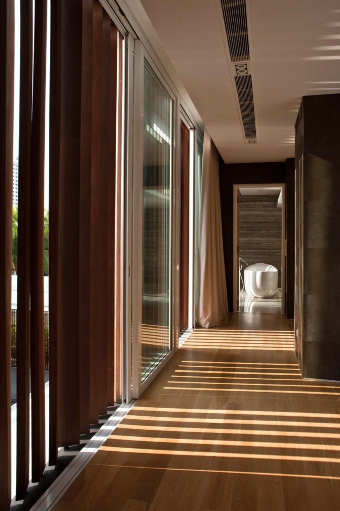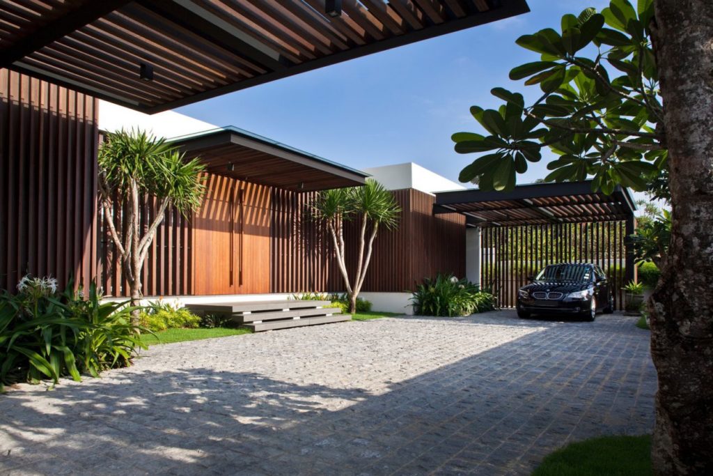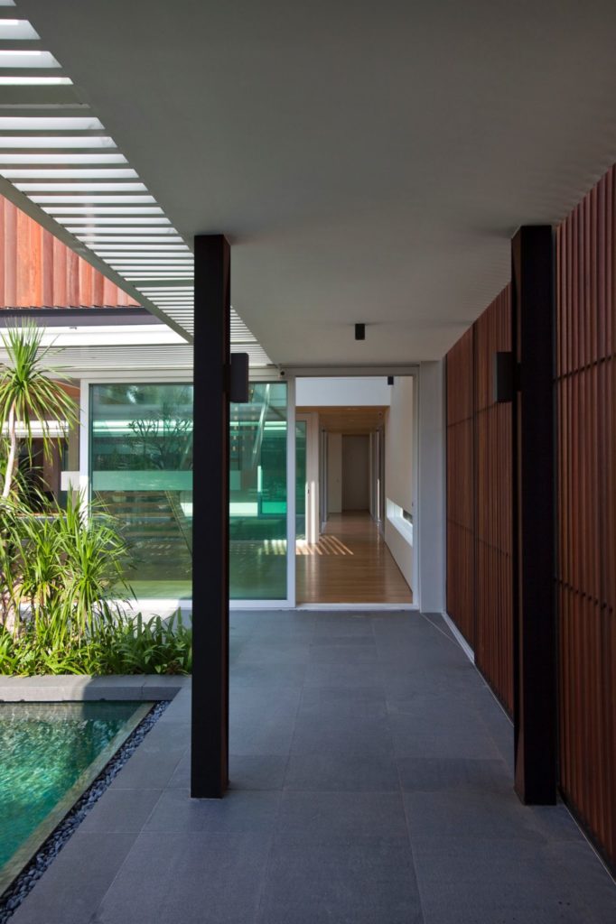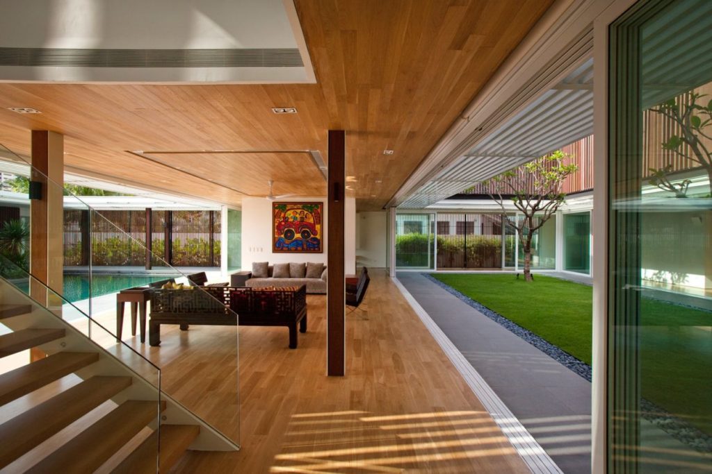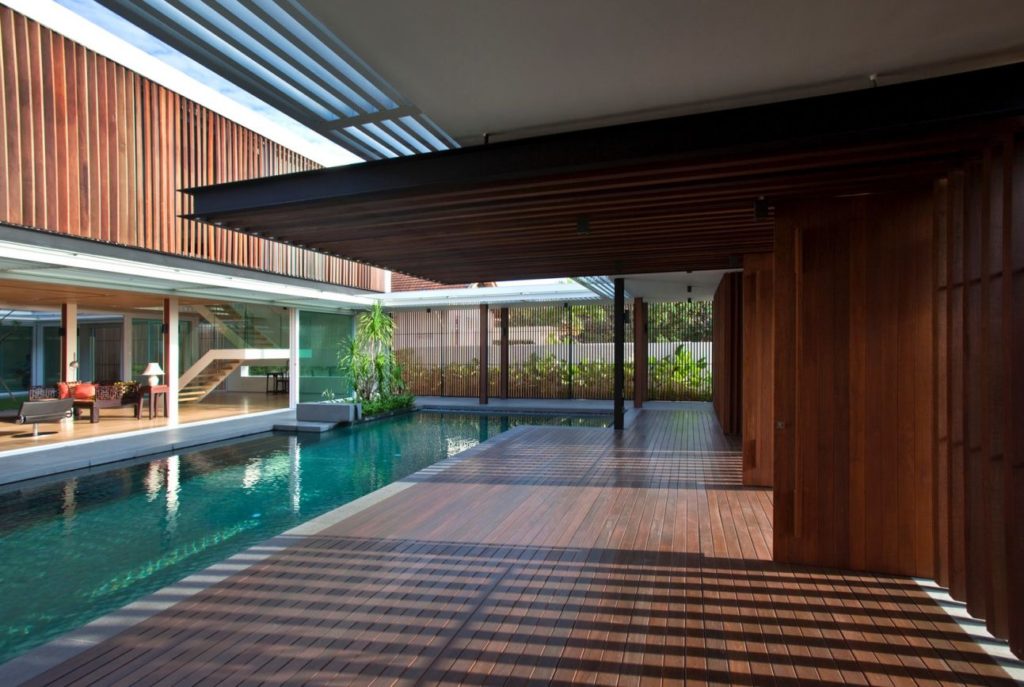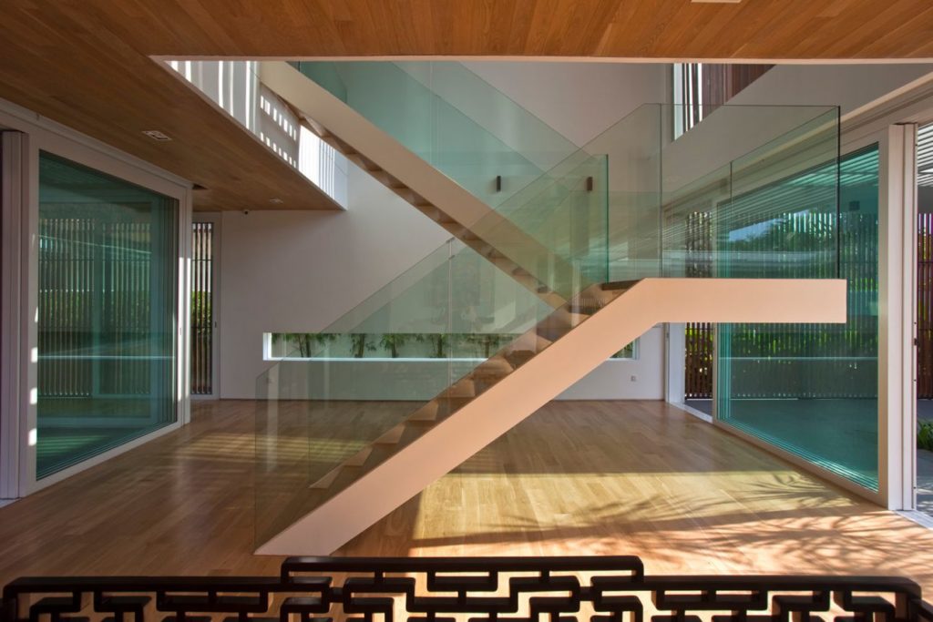 Homeowners want a modern House in Singapore, spacious home that can be opened as much as possible without compromising security and privacy. Surrounded by neighbors on four sides, the solution is a fully fenced compound with a localized space program like swimming pools and gardens, often considered the outside of the envelope of the house. By partitioning spaces such as bedrooms and waiters at alternative levels, i.e., 2nd floor and basement, ground planes are freed from the walls that will be required if public programs and private are placed alternately on the same plane. The see-through blocks allow for a continuous, uninterrupted 40-meter view, from the lobby and pool, through the formal living area to the garden courtyard and the formal dining area in the second episode. All of these spaces are considered within the building range of the house. Enclosed Open House in Singapore by Wallflower Architecture + Design.