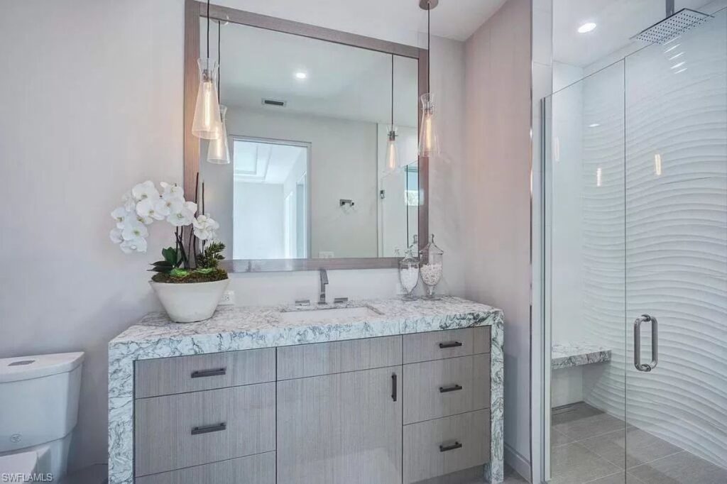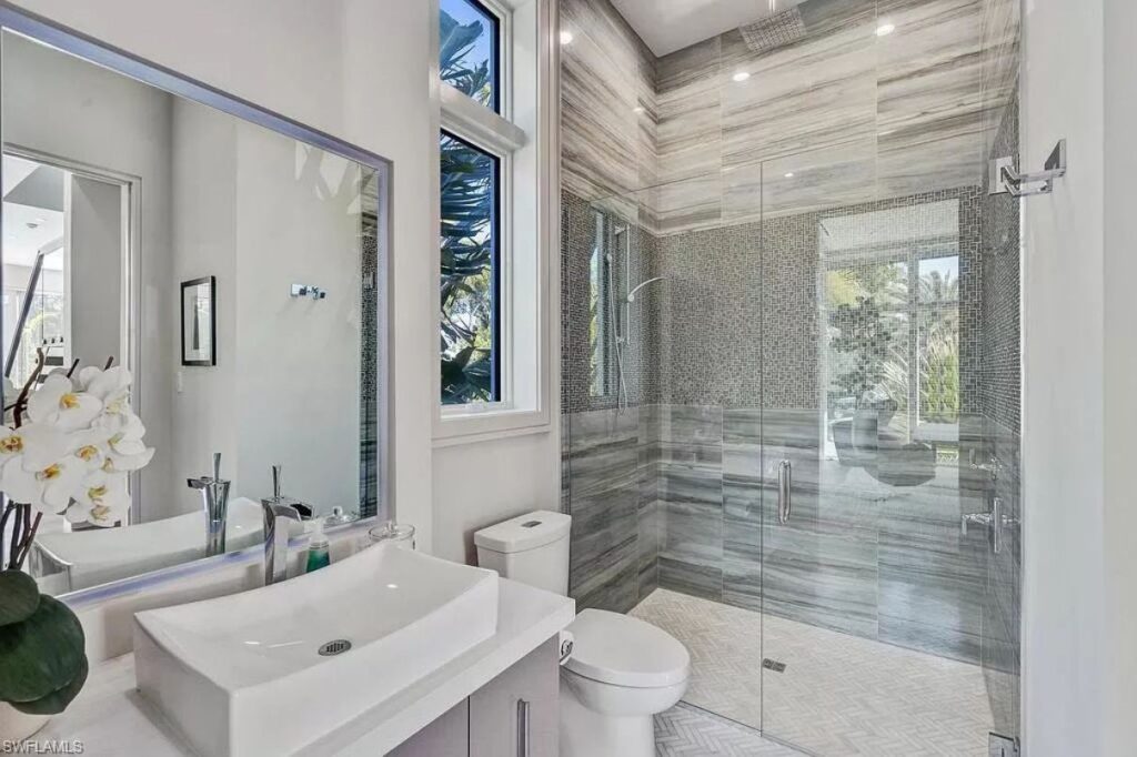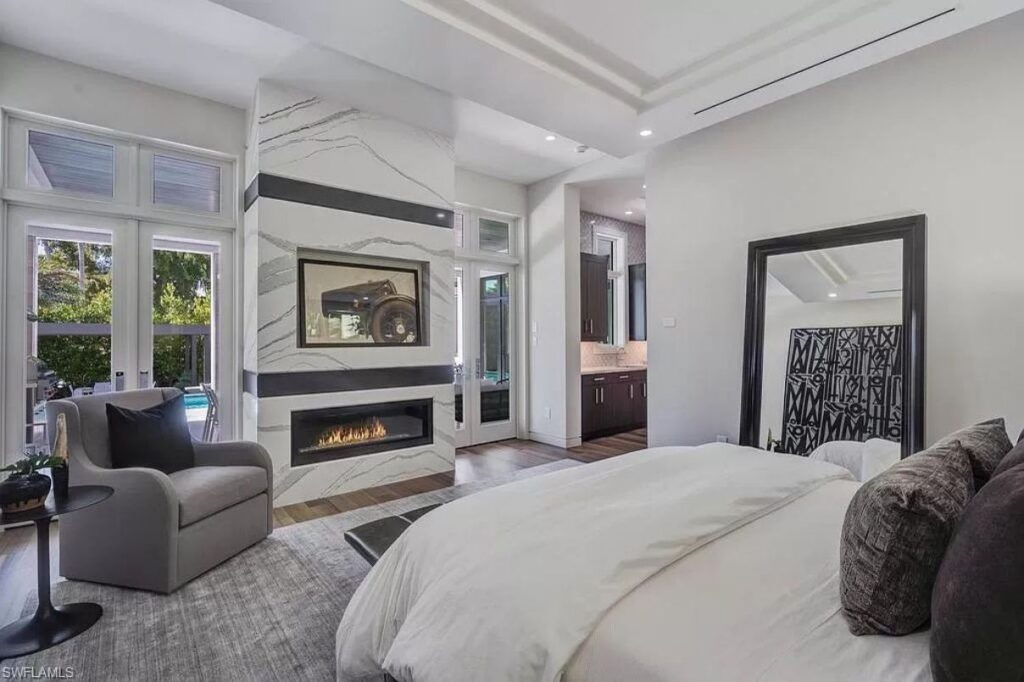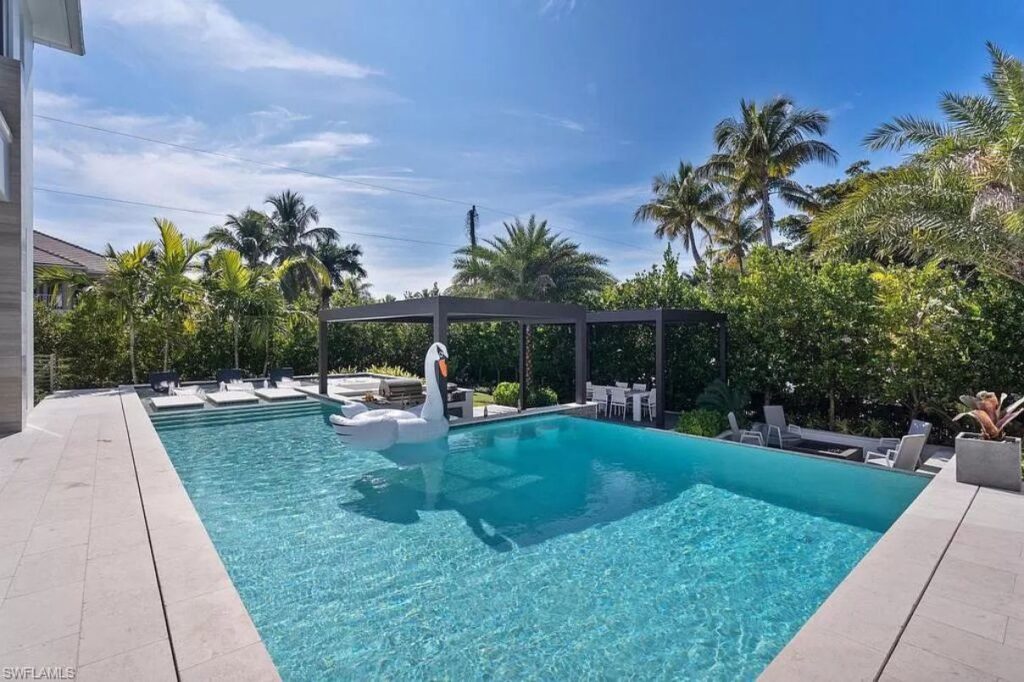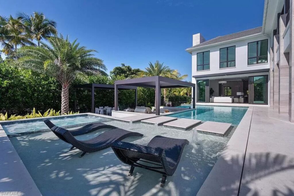 Text by the Agent: Introducing Gulf Shore Grand, a brand new modern masterpiece steps to the beach and only two blocks from 5th Ave S in Olde Naples. The home features clean lines and the highest level of luxury finishes. The spacious living room opens directly to the pool deck with pocketing sliders that create a seamless indoor-outdoor living experience. Outdoor features include a covered living room with roll down screens as well as a full outdoor kitchen, dining area, yard space and a fire pit on the lower level. The gas-heated infinity edge pool has a swim-up bar with in-water stools, a Cabo step with chaise lounges and an oversized hot tub. Turn on the water feature and multicolor LED lights for evening ambiance! Back inside, the main floor is complete with an open kitchen with gas range, wine bar with two wine coolers, ice maker, formal dining room, study, laundry room and the first master suite. Upstairs, you’ll find another spacious living room that opens out to your sunset deck with synthetic grass – it doubles as a bocce court! The second master and two guest bedrooms are also upstairs, along with a second washer, dryer.