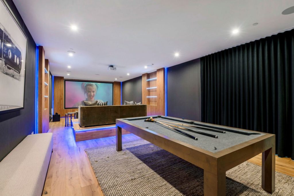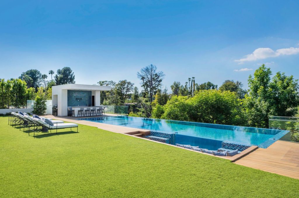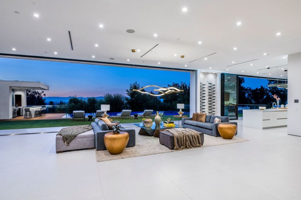 Oak View Modern Masterpiece offers breathtaking panoramic views with a grand open floor plan, exceedingly high ceilings, and luxurious touches throughout. The expansive living room seamlessly flows to the chef’s kitchen, dining room with a stunning bar. The glamorous backyard showcases a lush lawn, radiating infinity zero edge pool, cozy sunken fire pit, spacious wood deck, and a trendy outdoor kitchen. Luxurious Oak View Modern Masterpiece in Encino.