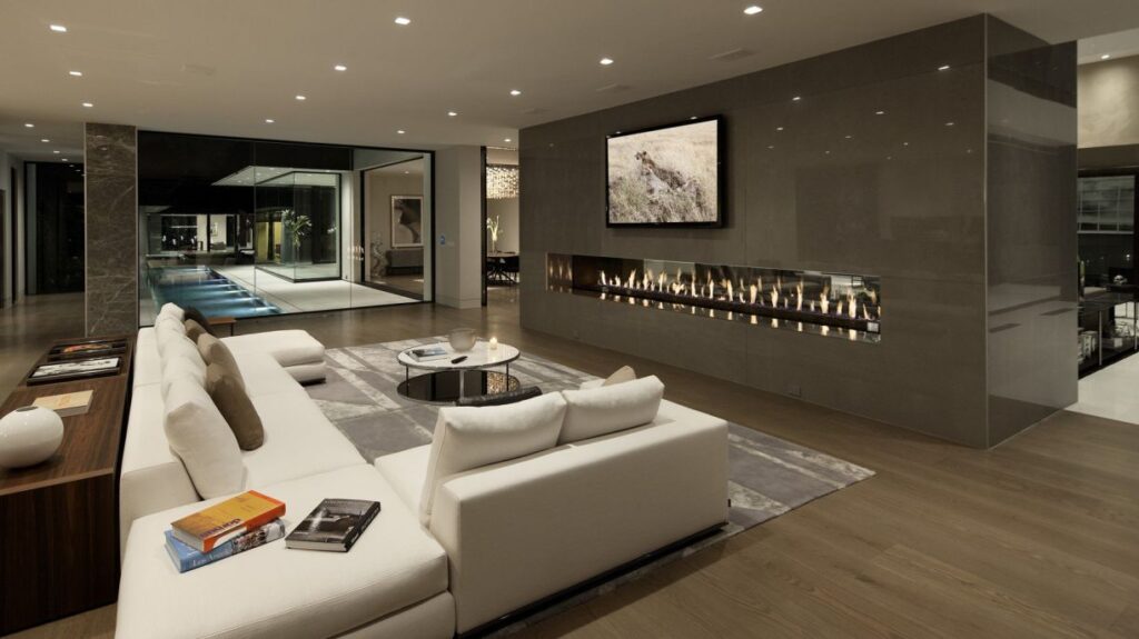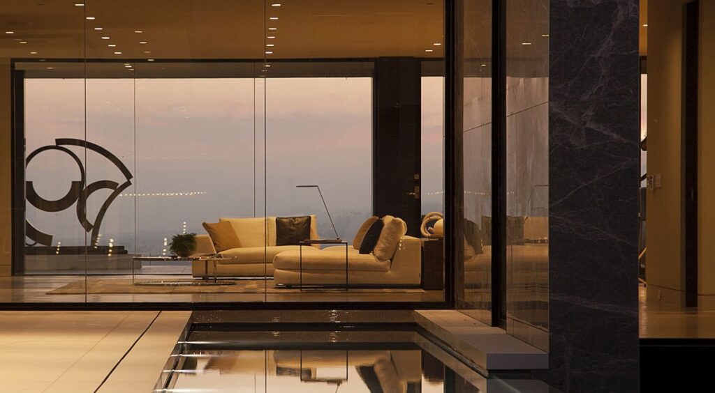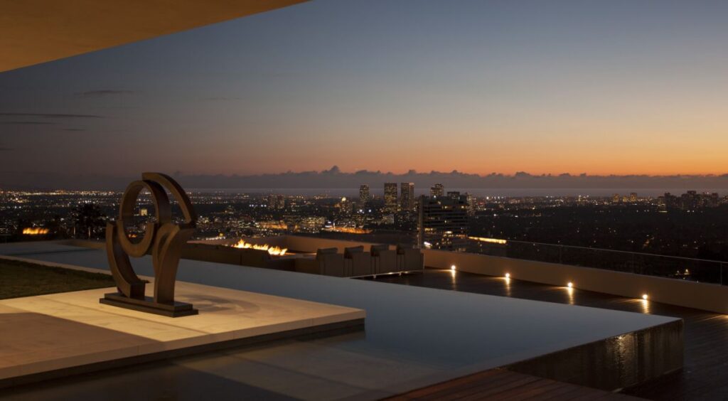Oriole Drive Modern Home sits on over 1.2 acres of private land, accessed by a gated and long private driveway, was designed by McClean Design. This home is approached by means of a gated driveway and guard house. The main house is approached along the water feature by means of a short stair which leads to the front hallway. The main living room is two stories tall and enjoys spectacular views of the Los Angeles Basin and the ocean beyond. The combined kitchen and family room has a more intimate feeling than the living room and appears to float over the water feature. Below the main level are two large bedroom suites each with their own outdoor area. Luxurious Oriole Drive Modern Home in Los Angeles by Paul McClean.