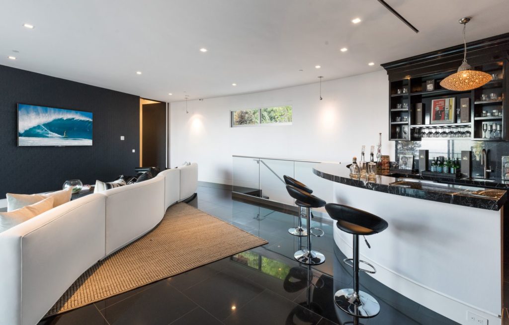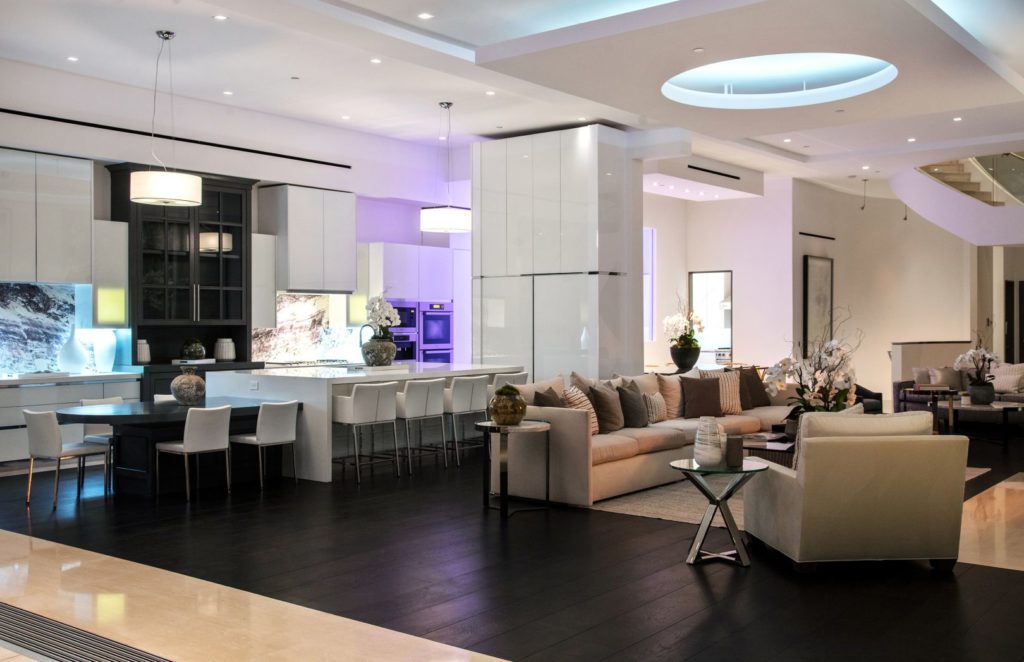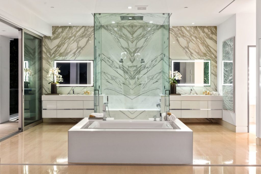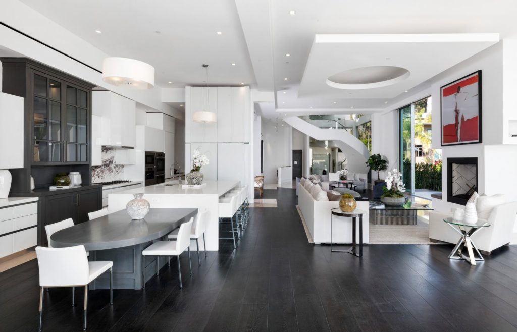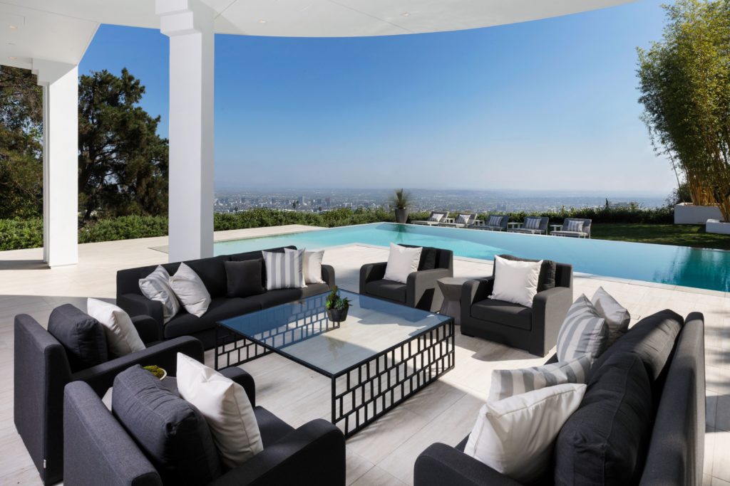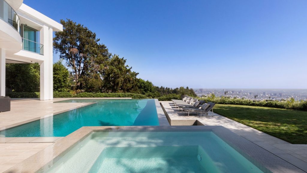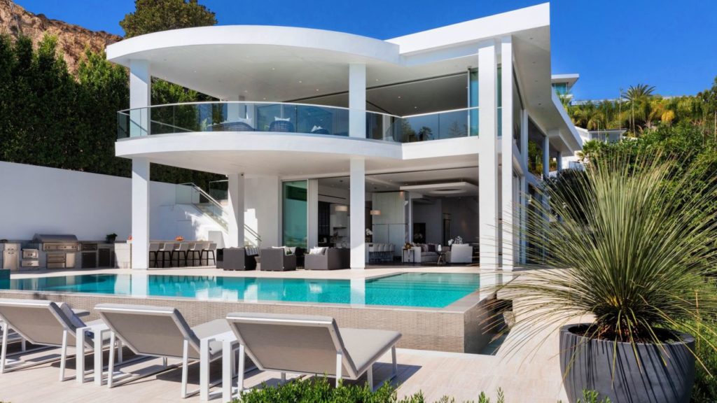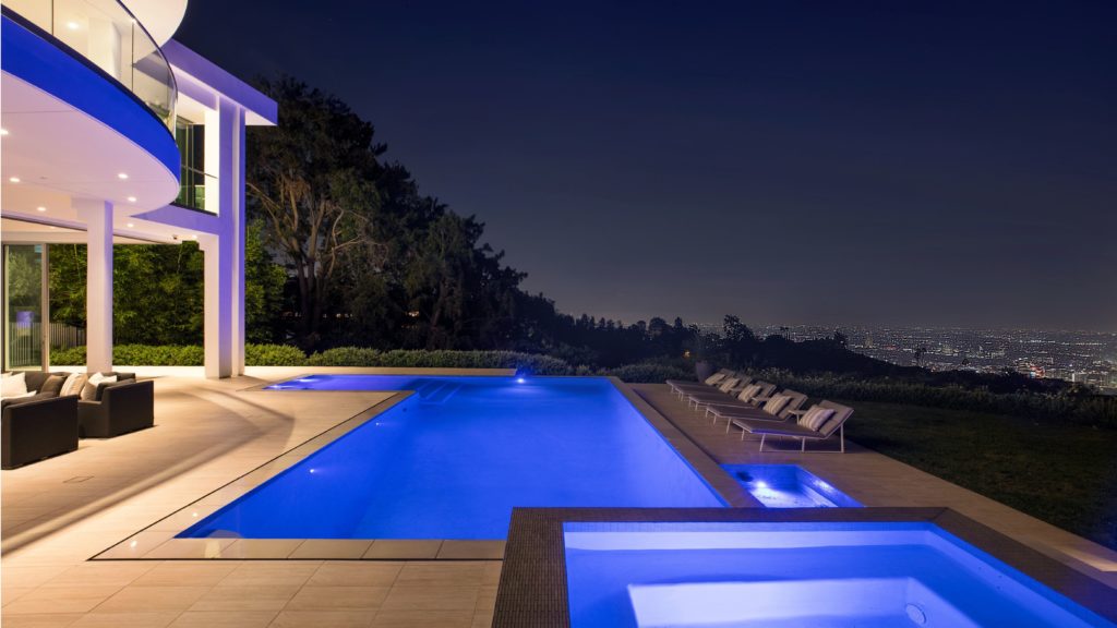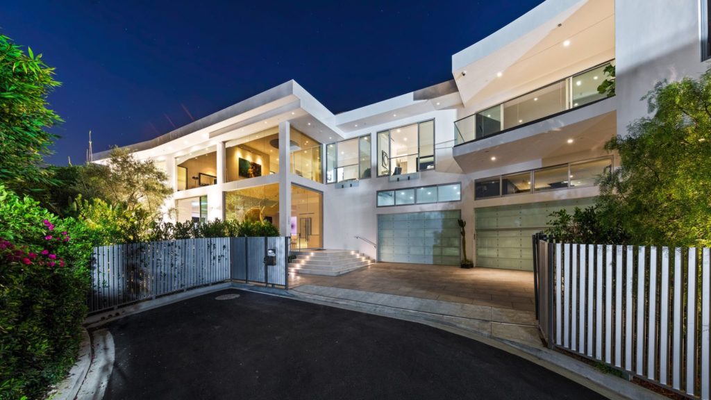Magnetic Ter Modern Home situated above Sunset Blvd on a quiet cul-de-sac; an astonishing 6 bedrooms, 8 bathrooms, modern home lined with breathtaking city views. Enter through the gated driveway to find the sprawling 12,000 square feet 3 story showplace. The home features a 2500 square feet living area, large chef’s kitchen with oversized island and butler’s pantry, and it’s own wellness center and salon. Retire to the massive master suite with an office, 2 walk-in closets, and infinity bath tub. Entertain by the 30,000-gallon infinity pool, outdoor kitchen, theater, and Tuscan olive garden, all while taking in the endless views from atop the Hollywood Hills. Magnetic Ter Modern Home in Los Angeles.