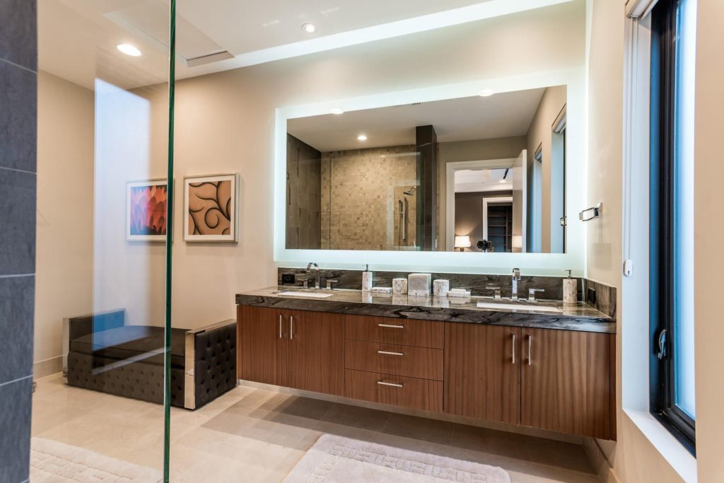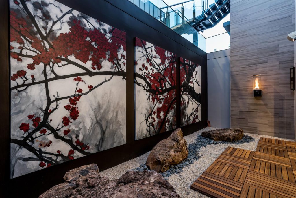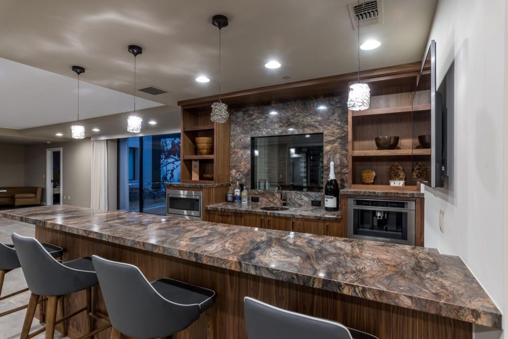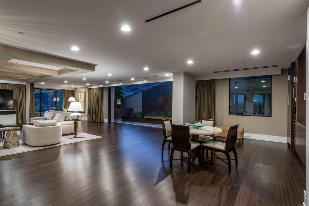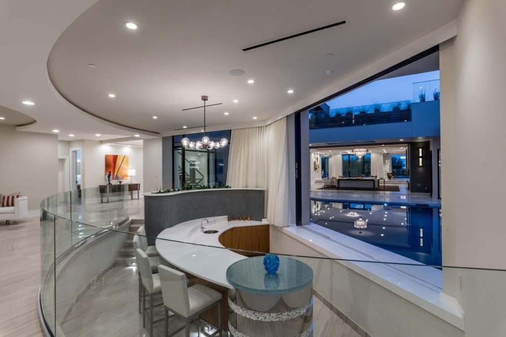 When the gates open, the gaze turns to the elegantly laid stone driveway that travels around a sunken pond filled by a waterfall trickling down the desert mountain. The curved driveway leads to the grand porte-cochere entrance of 9 Echo Peak better known as SkySide a one-of-a-kind residence designed by its world-renowned architect owner and constructed by internationally known, award-winning Sunwest Custom Homes.