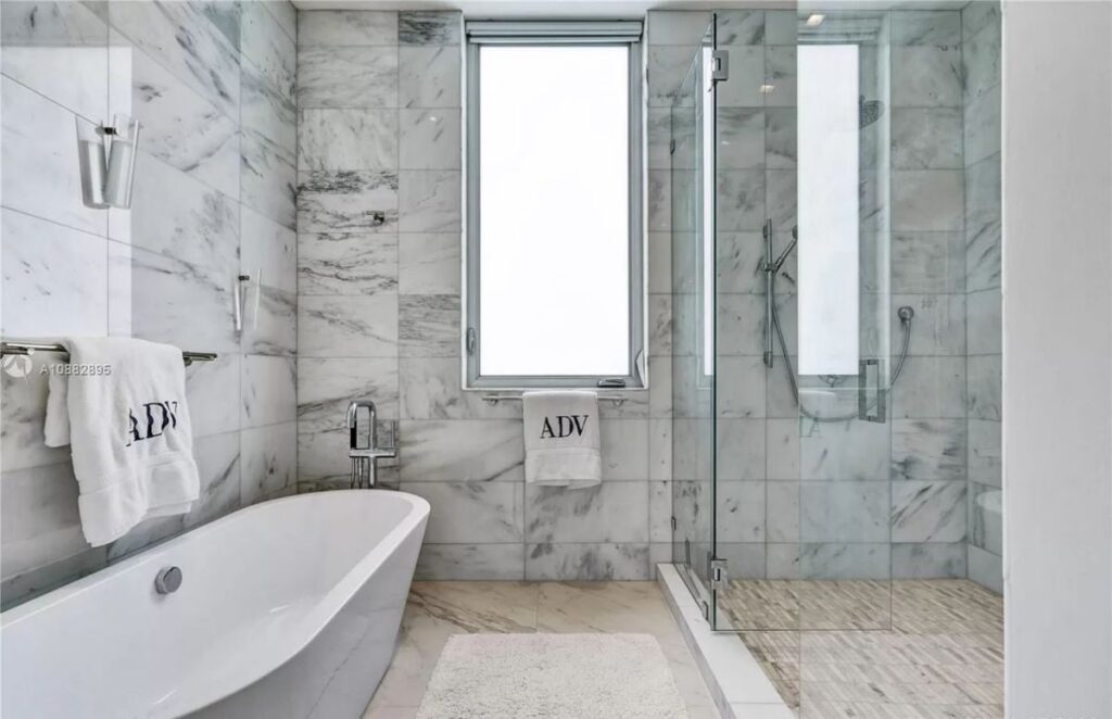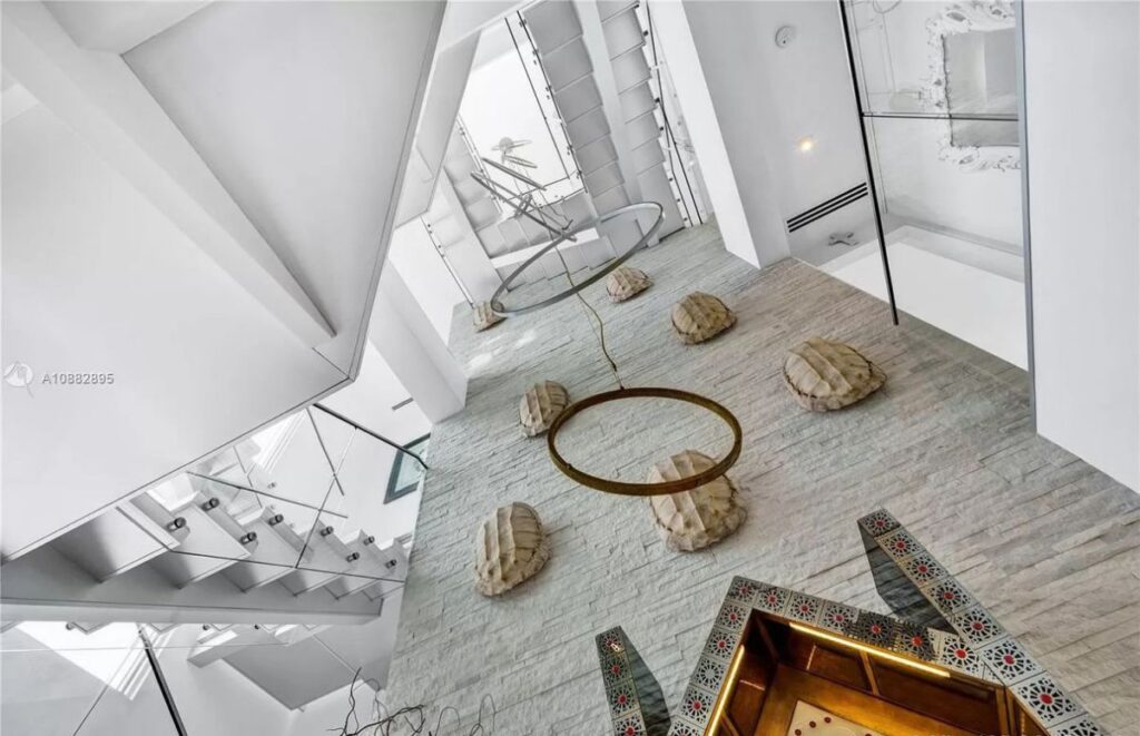 Text by the Agent: Breathtaking water and sunset views! Over 5,000 square feet with 6 bedrooms, 7 bathrooms, Office, Bar, Elevator, 6 car parking, 3 under roof garage, beautiful floor to ceiling windows and Italian Carrera Marble Porcelain floors. 11 foot Ceilings through the estate with unreal 360 Degrees Views of Stiltsville, Biscayne bay and Downtown Miami. Sitting on a 10,000SF lot with 760 square feet of balconies on the 3rd Floor, and an over 2,200SF 4th Floor rooftop terrace. The first level includes a 800 square feet pool cabana with a full bath, shower and bbq kitchen area surrounded by the pool and a lush green garden.Crestron Smart home. Unique features include a 40 foot high atrium, with widows that neatly stack in alignment opening the living areas to the balconies. Furniture can be included.