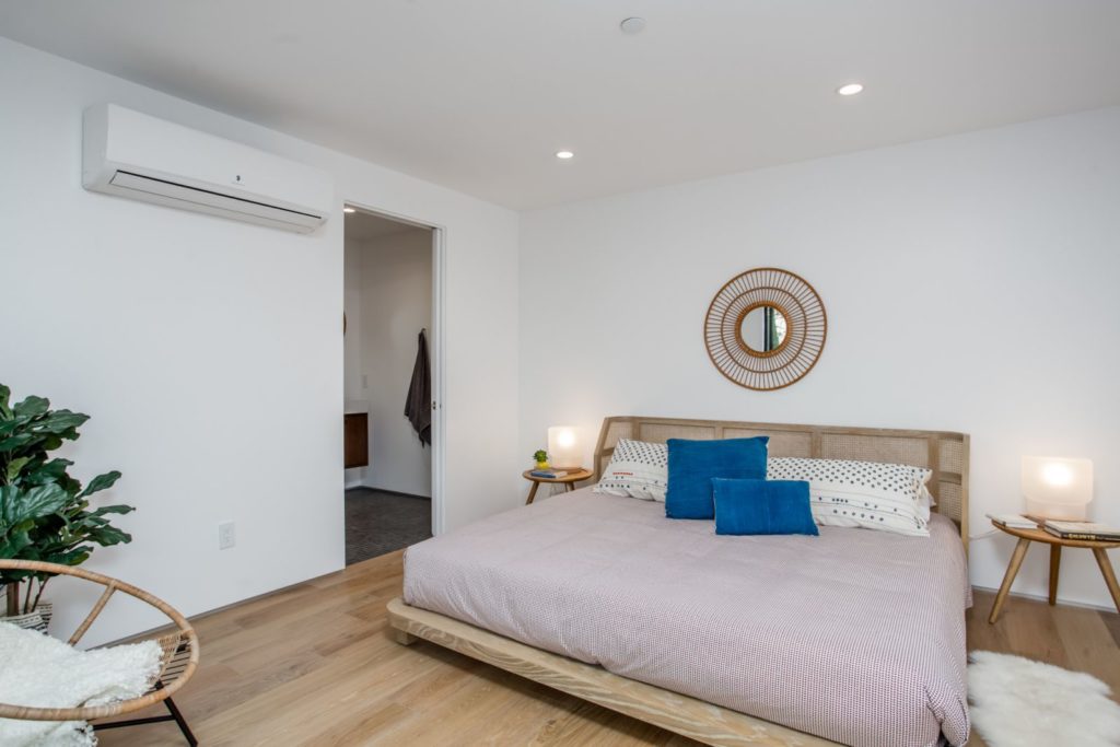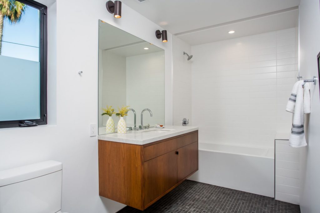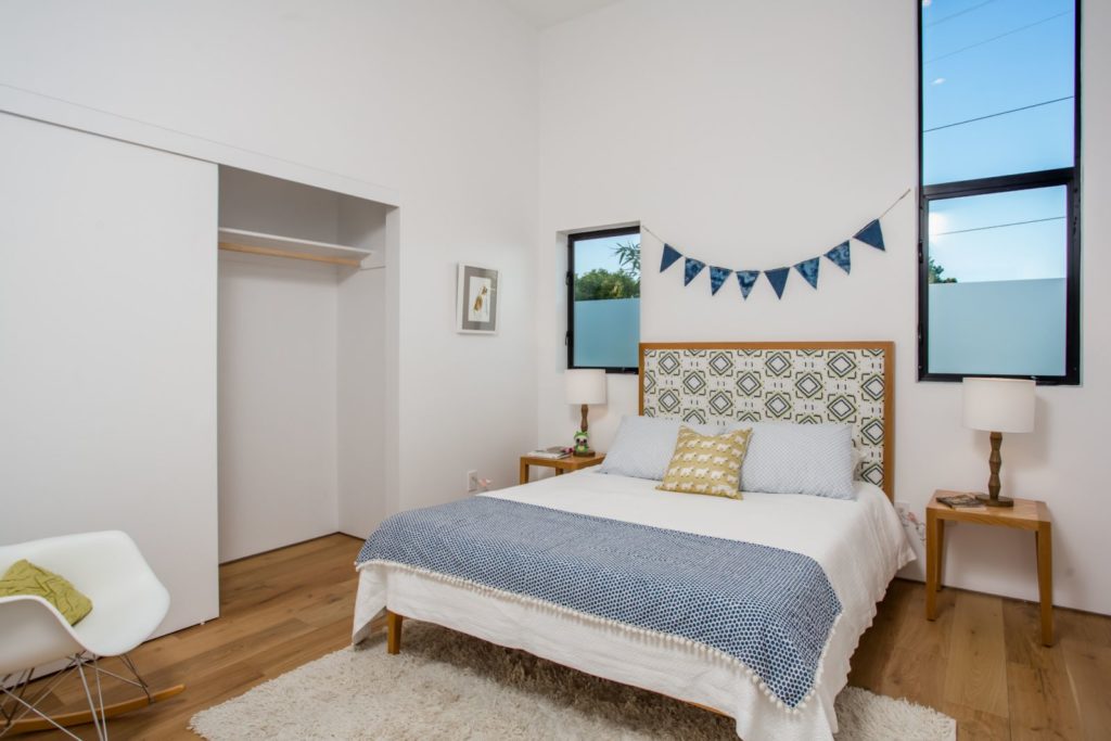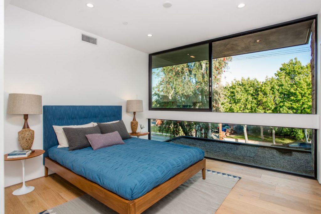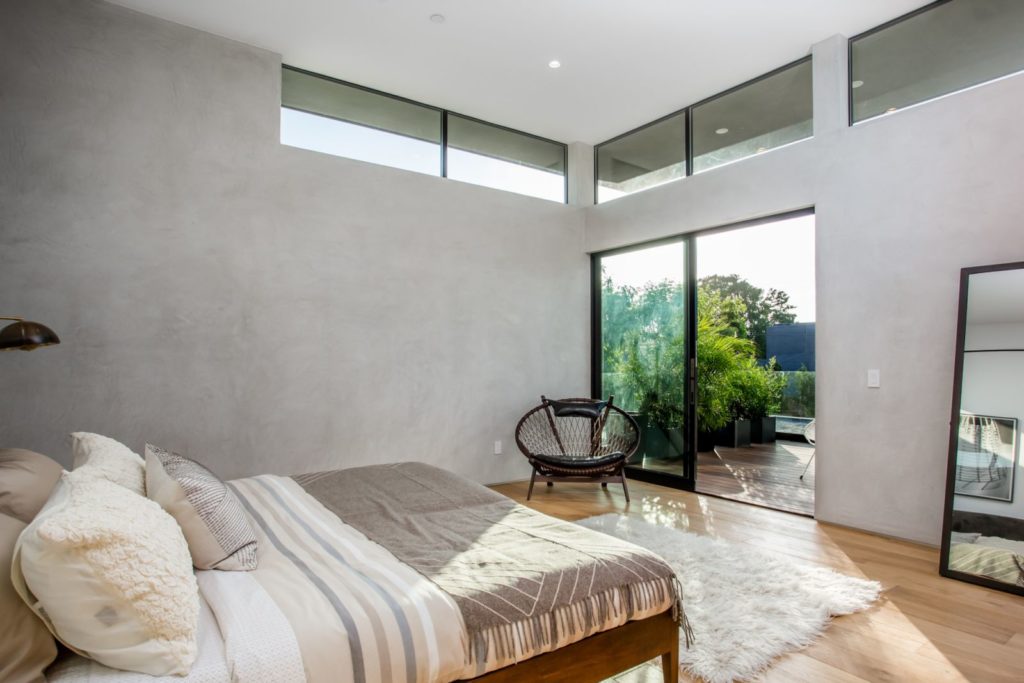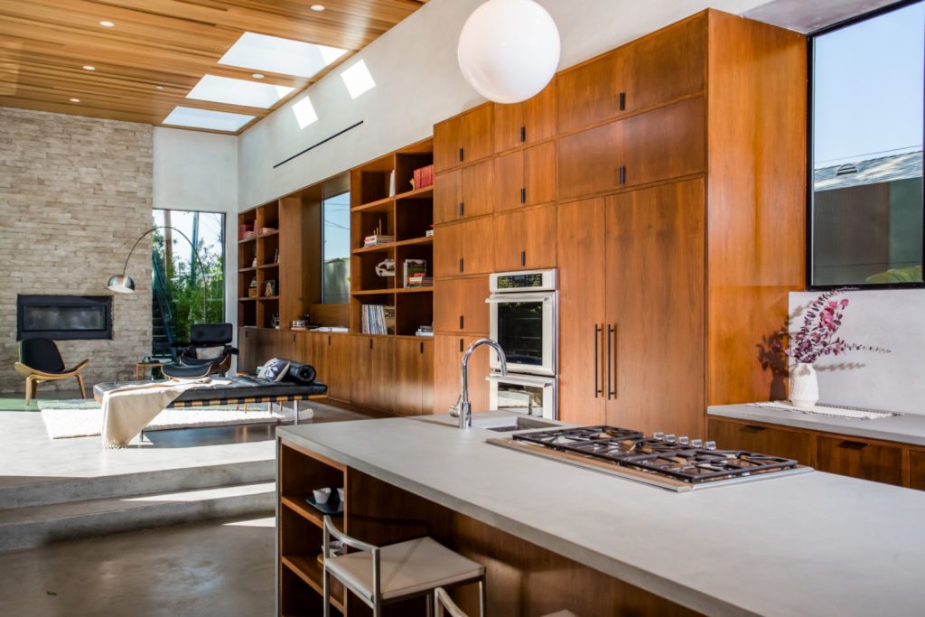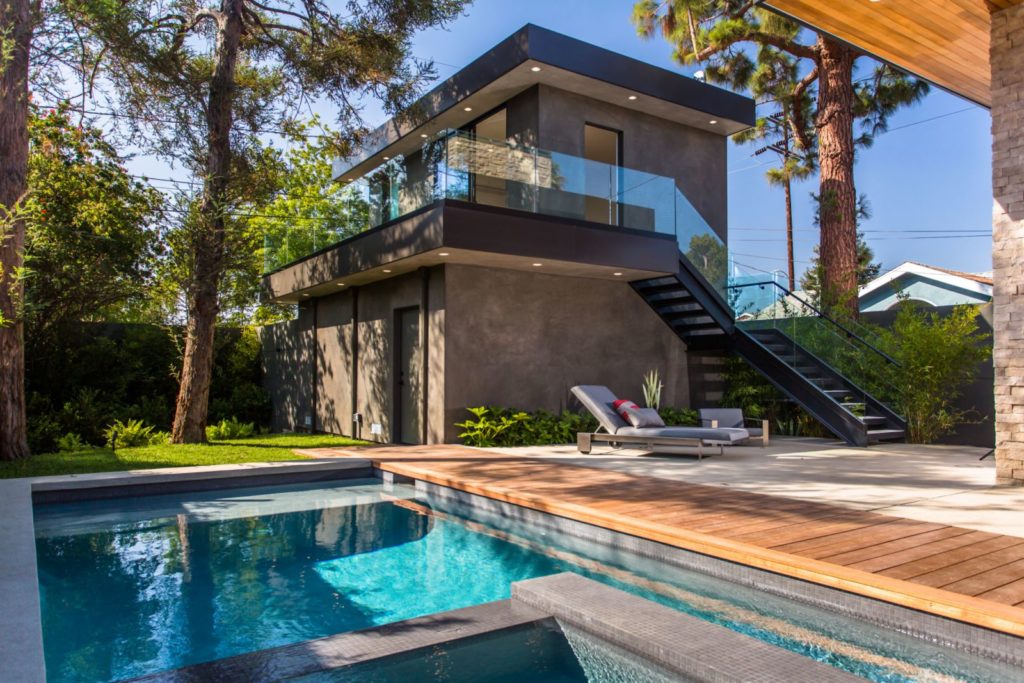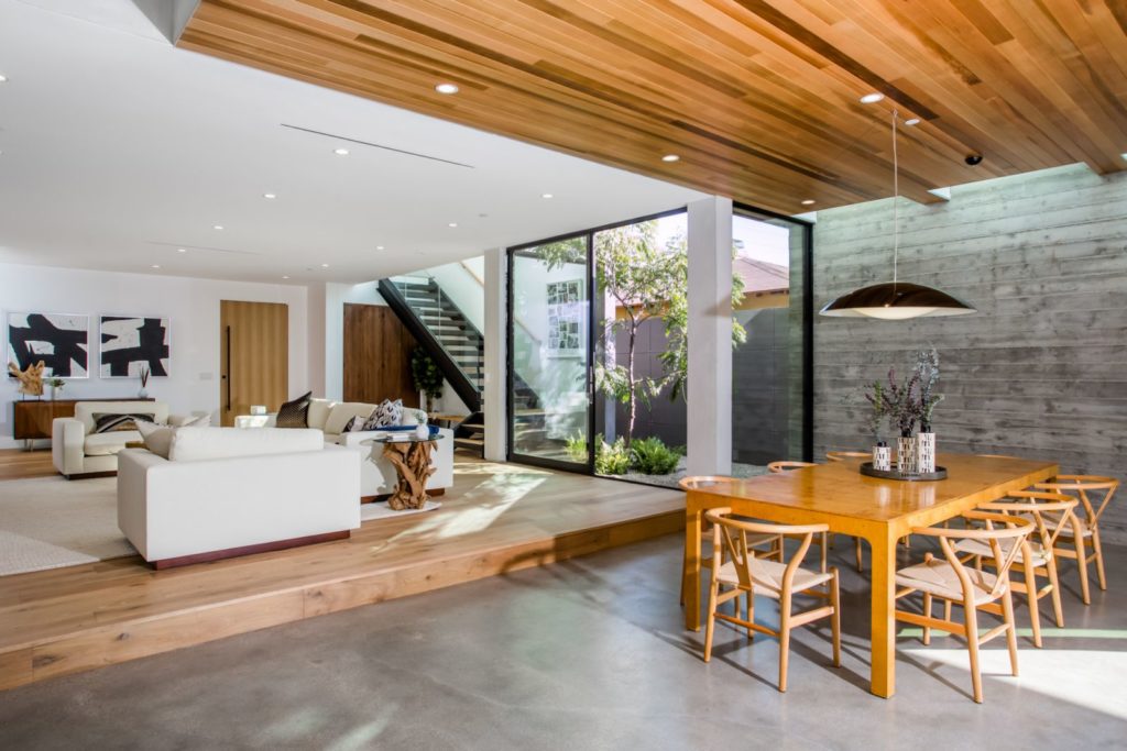 The Modern Home Palms Boulevard – An oasis of elegant living equally perfect as a family compound; and entertainer’s showpiece – Electric Bowery’s beautiful display of contemporary design also pays homage to the Mid-Century Modern masters. Enjoy this modern home with four en suite bedrooms plus an additional studio with bathroom above a two car garage. The soaring ceilings create tremendous volume in the living area with elegant designer finishes. Walls of glass seamlessly merge indoor living spaces and outdoor area with old growth Redwoods; grassy play area with sparkling pool and spa – all on an expansive 8,000 square feet lot. Concrete and French oak flooring; Modern Home Palms Boulevard in Venice of contemporary design.