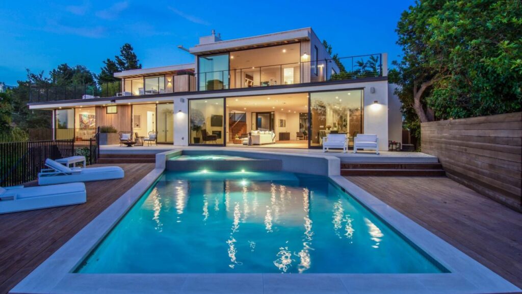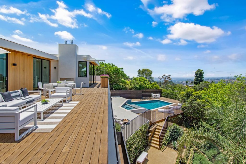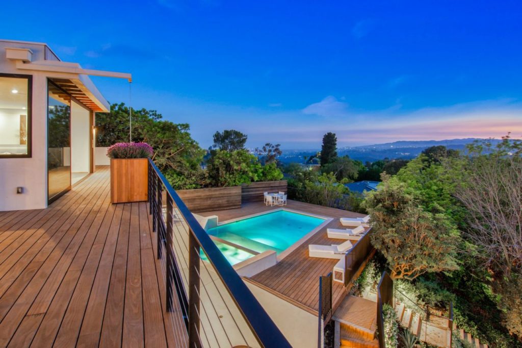 Modern Luxury Alto Cedro Drive Residence in Los Angeles is newly rebuilt private retreat. Be mesmerized by the fabulous exterior with wood beams, seamlessly connecting the home to its natural surroundings. Extensive picture-perfect views of the ocean, valley, canyon and city visible from every room. A sumptuous kitchen boasts luxurious finishes including a Subzero fridge, wine cooler and Miele appliances. Enjoy the abundant and commodious master bedroom anchored by a cozy fireplace with floor-to-ceiling doors to the patio with awe-inspiring views. The dissipated master bath including graceful stone details and a wonderful walnut walk-in closet. Additional features including maid’s quarters with private side entry and top-of-the-line accents throughout. Entertain to your heart’s desire in the outdoor haven, with multi-level decks, fireplace, sparkling pool and spa, and secluded seating areas encapsulated by lush landscaping. The epitome of Modern Luxury Alto Cedro Drive Residence.