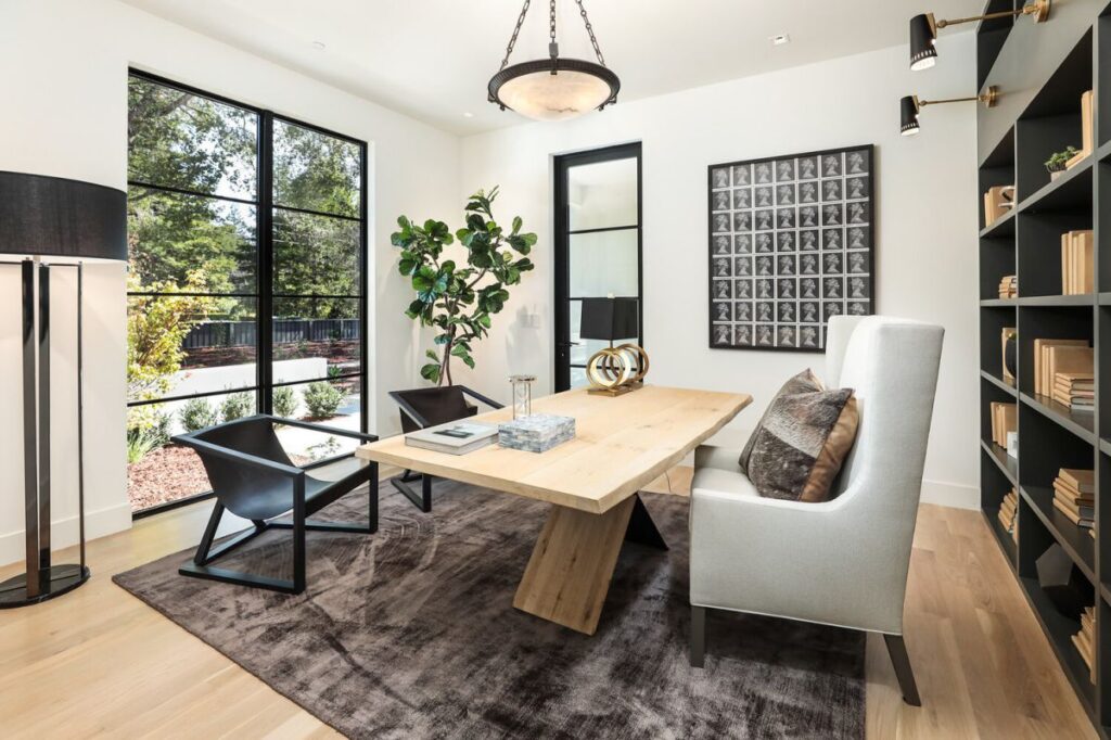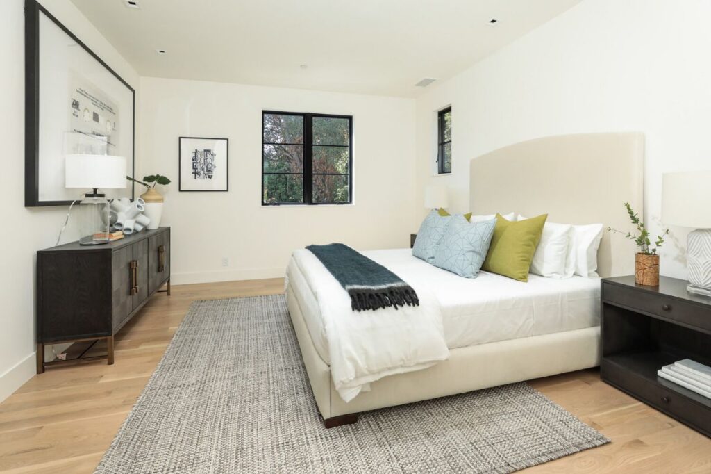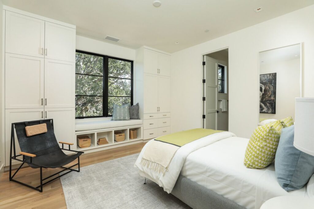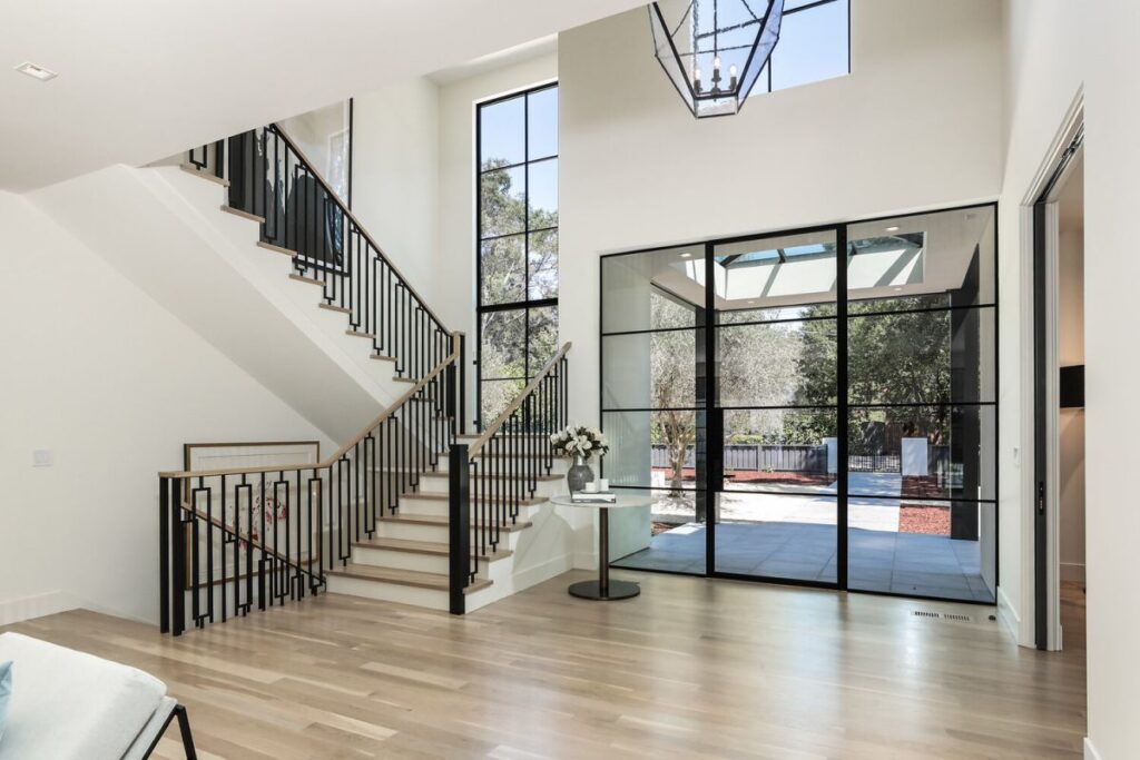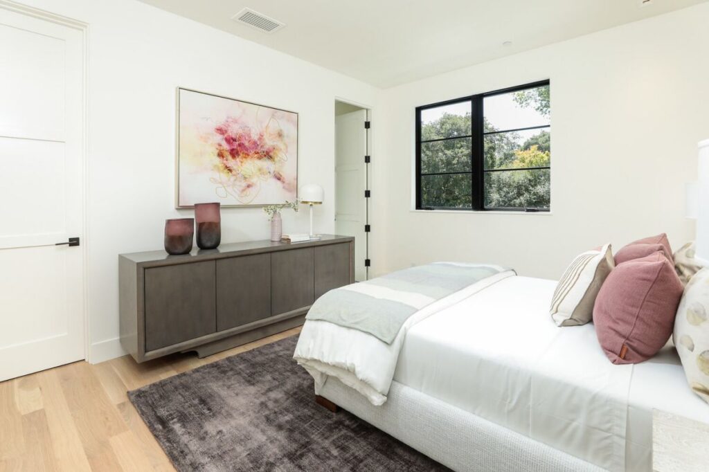 Six bedroom suites easily accommodate multi-generational households, as well as those with staff, plus there is a detached guest house. A junior suite is conveniently located on the main level with a private outside entrance; while the lavish primary suite is found upstairs along with three more bedroom suites. Every bedroom has a walk-in closet, two bathrooms have curbless showers for ease of use, and the primary suite bath includes a steam shower. New Modern European Atherton Home for Sale.