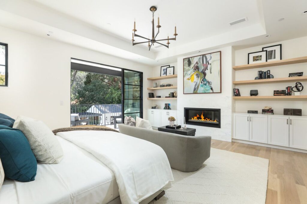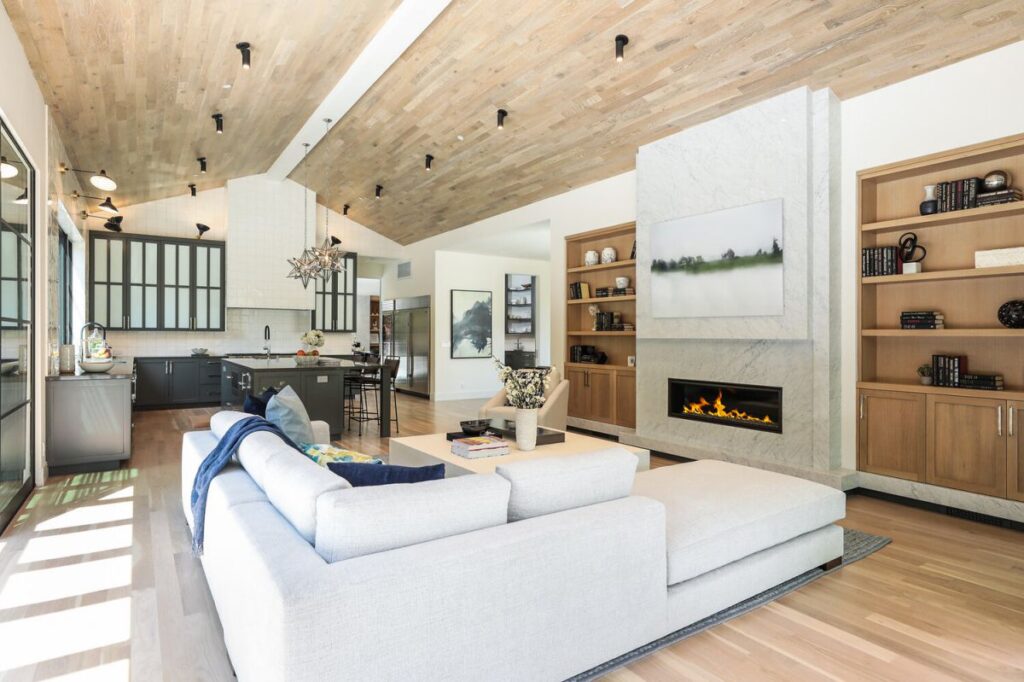 Text by the Agent: This extraordinary new Atherton Home for Sale is a masterpiece of chic sophisticated design with a modern European flair; introduced by crushed stone paths and olive trees. An all-glass entrance opens to the three-story main residence where fine oak floors unify every room along with crisp white walls and accents in deep slate grey. Every level is full in natural light with walls of sliding glass doors; expansive windows, and skylights. Numerous linear gas fireplaces add modern panache, including one surrounded in book-matched marble that stands as a piece of art.