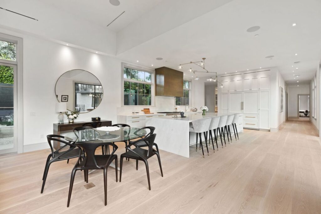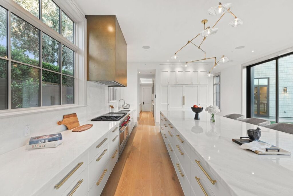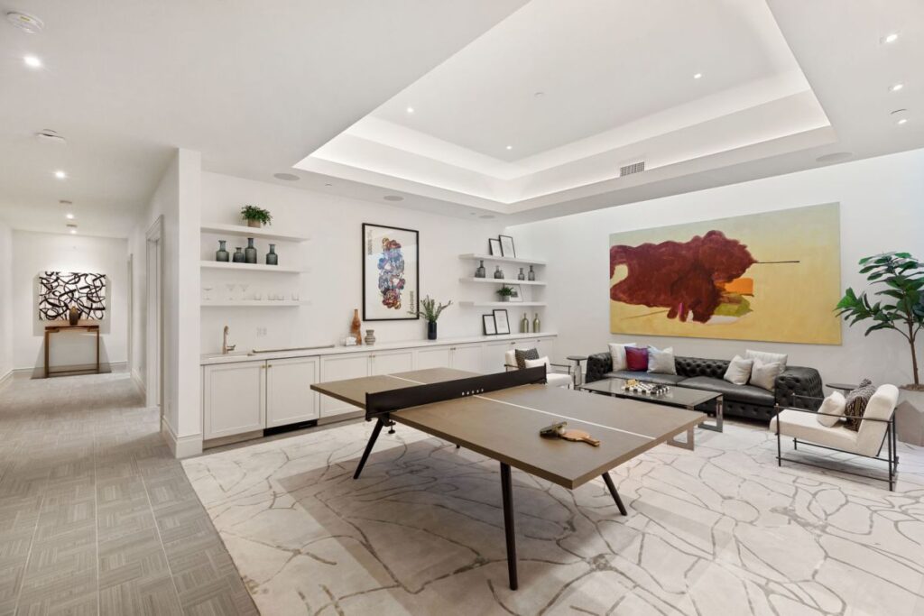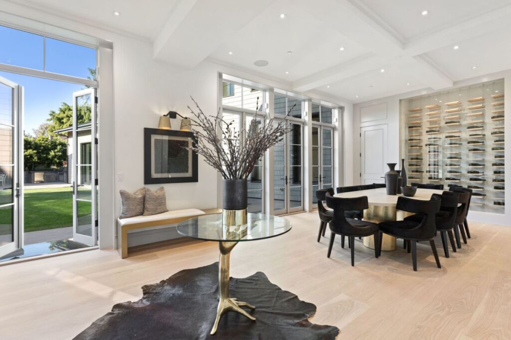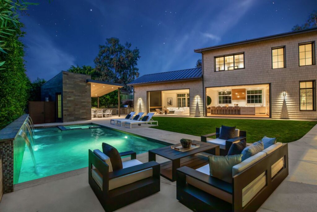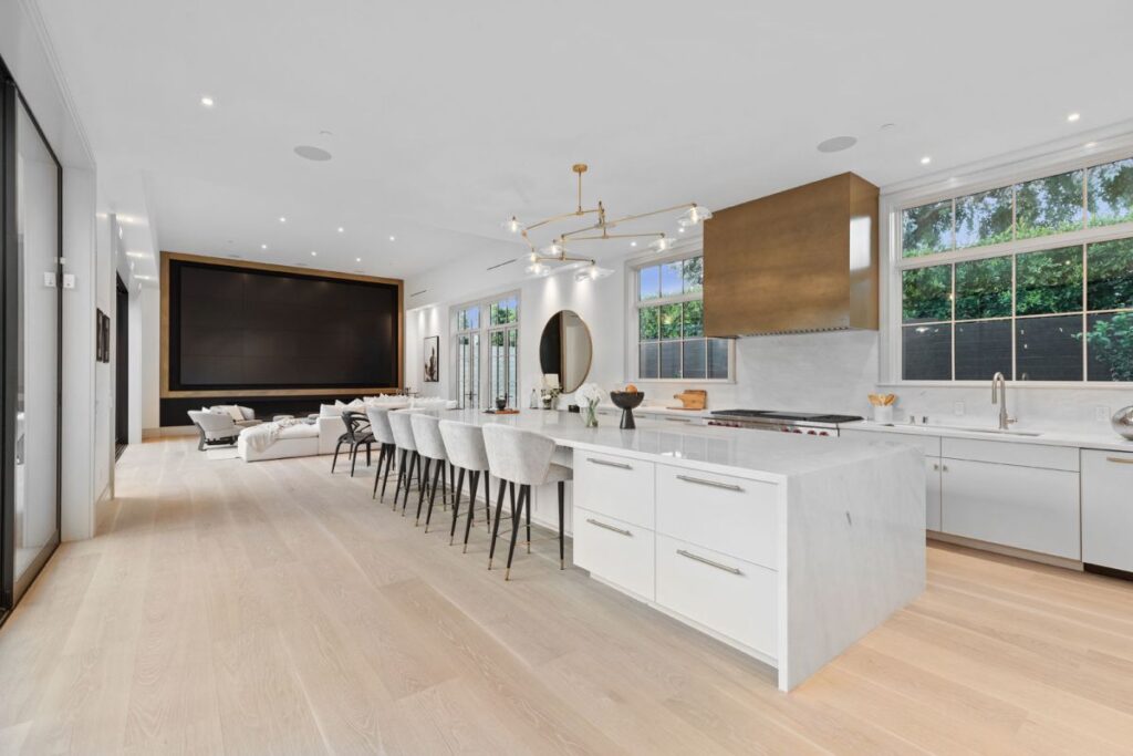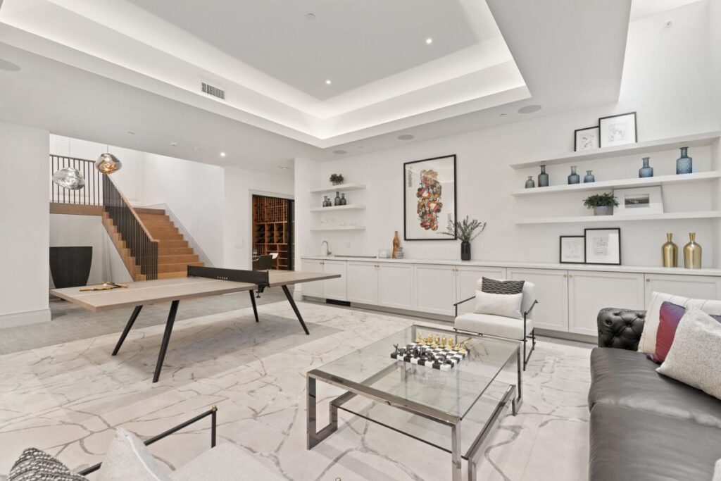 Text by the Agent: Brand new construction set in the coveted Huntington Palisades, Pacific Palisades. This is not a spec home but rather an Owner/User’s sophisticated masterpiece with unrivaled attention to detail and craftsmanship, which was the spirit and theme to this “no-budget” build. An 11,607 square feet architectural statement set on a 15,027 square feet corner lot with pool, spa, waterfall and detached pool cabana. 7-bedroom suites, 10-bathrooms, an opulent library/study, wet room, separate master suite office, 2,160-bottle temperature controlled wine rooms, Dolby Atmos movie-theater, elaborate Savant Pro home automation and game/recreational room. Facing the backyard with 40′ of floor to ceiling Fleetwood doors, is a massive kitchen/great room with 16’x9′ Dolby Atmos video wall and separate full functioning prep kitchen with service entrance. A one-of-a-kind custom home set in the cozy beach community of the Pacific Palisades, just steps to the village shopping, schools, movie-theater, restaurants, beach, bike path & hiking trails.