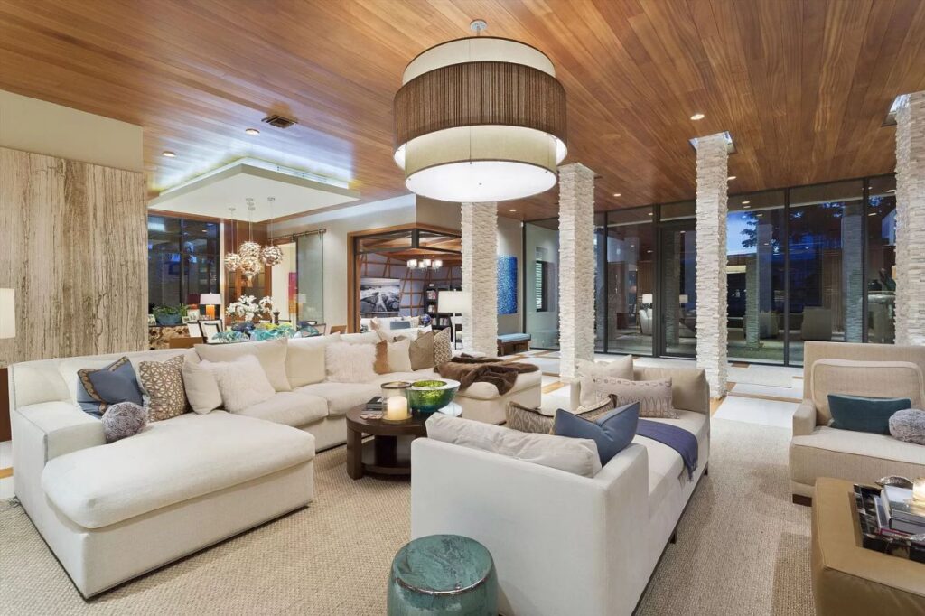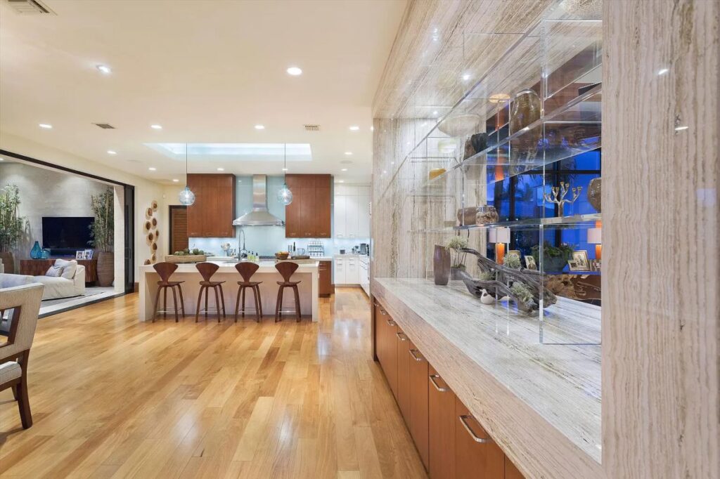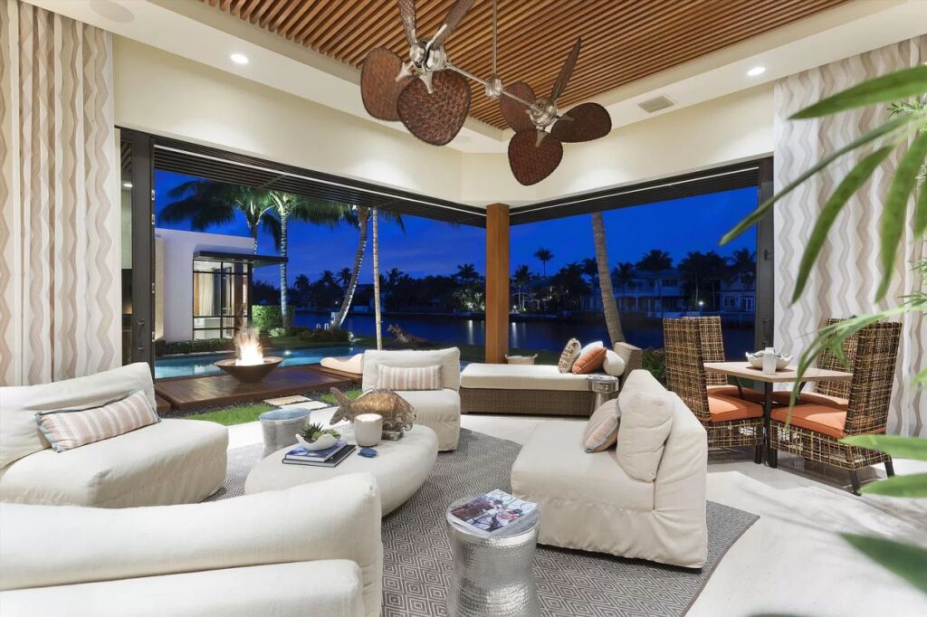 The design features an open floor plan with large expanses of glass taking advantage of views north and south along the Intracoastal waterway. The layout and finishes of the home provide for a seamless connection from the interior to exterior for genuine indoor-outdoor living.