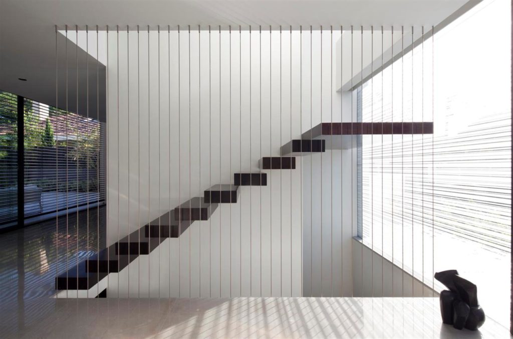 Wooden strips material; and color range from white to gray used for both the interior; and the exterior of the modern house. The composition of the geometric light shows against the vertical; and horizontal surfaces; made from different materials; creates a rarely atmosphere in the internal area; and the residence’s exterior; that make a effectual enunciation of consistency and equanimity. The courtyard was designed; based on inspiring by the same restraint of form; with the choice of trees; and their placement also communicates; with the avenue and the surrounding environment. Spectacular Haifa Modern House in Israel.