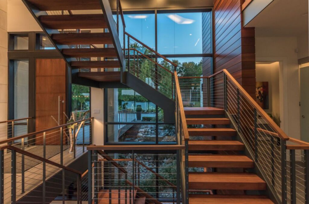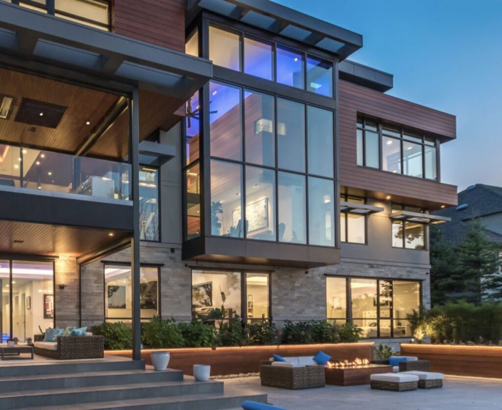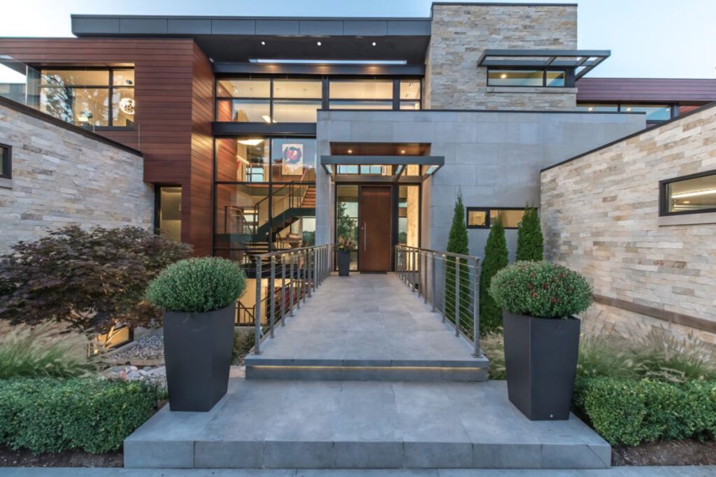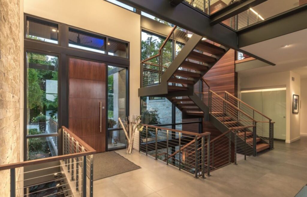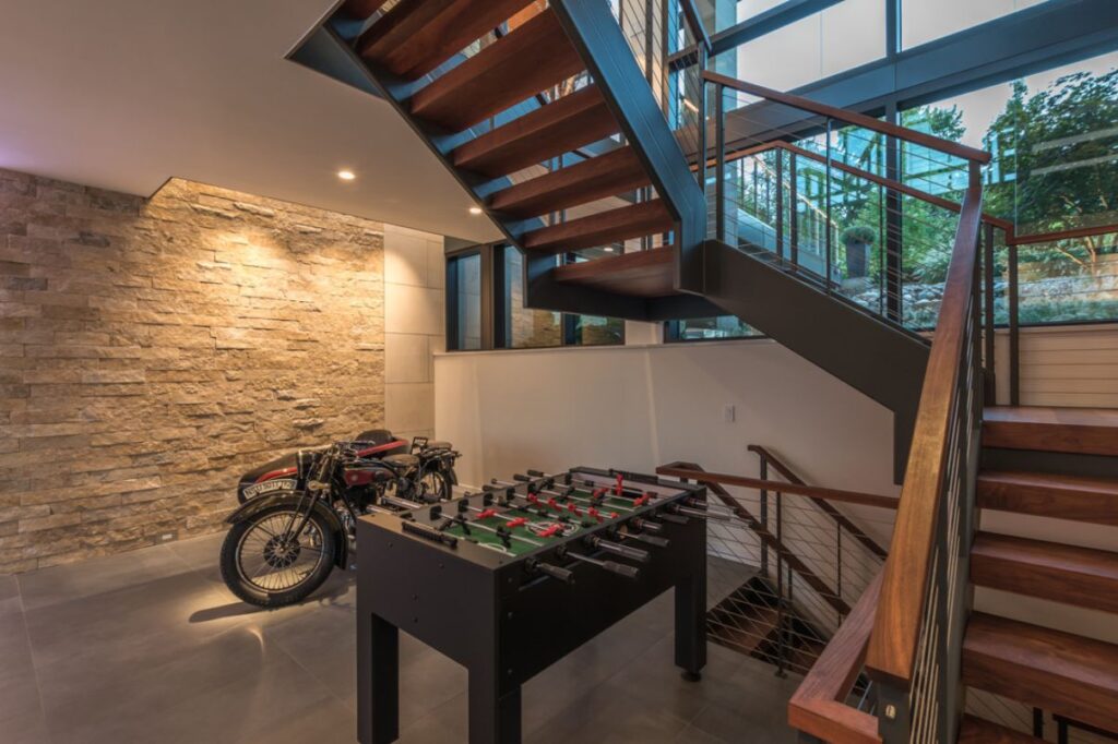 The 5 bedroom, 13,000 square ft. modern residential home has a flat roof and boasts 4 levels of floor to ceiling windows and high, dramatic ceilings. Floating stairs and glass bridges help connect various rooms with a modern and luxurious feel. The space under the 5 car garage was used to create a home theater and storage area. Another unique feature is a range that was taken apart and custom built into the quartz counter top in the kitchen area.