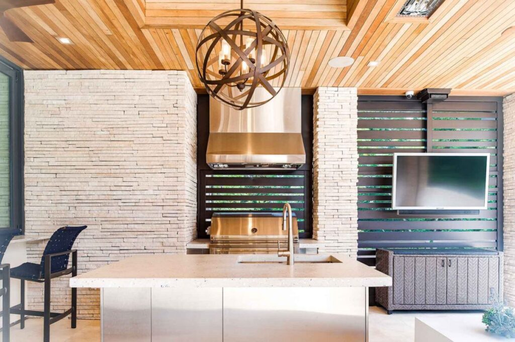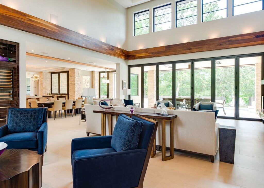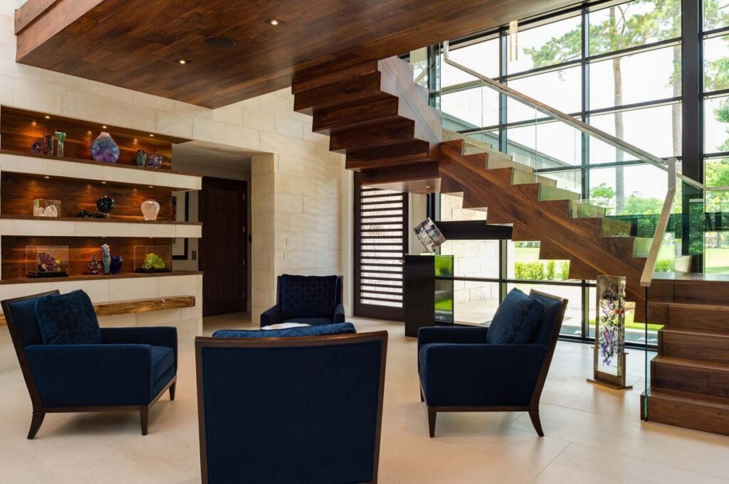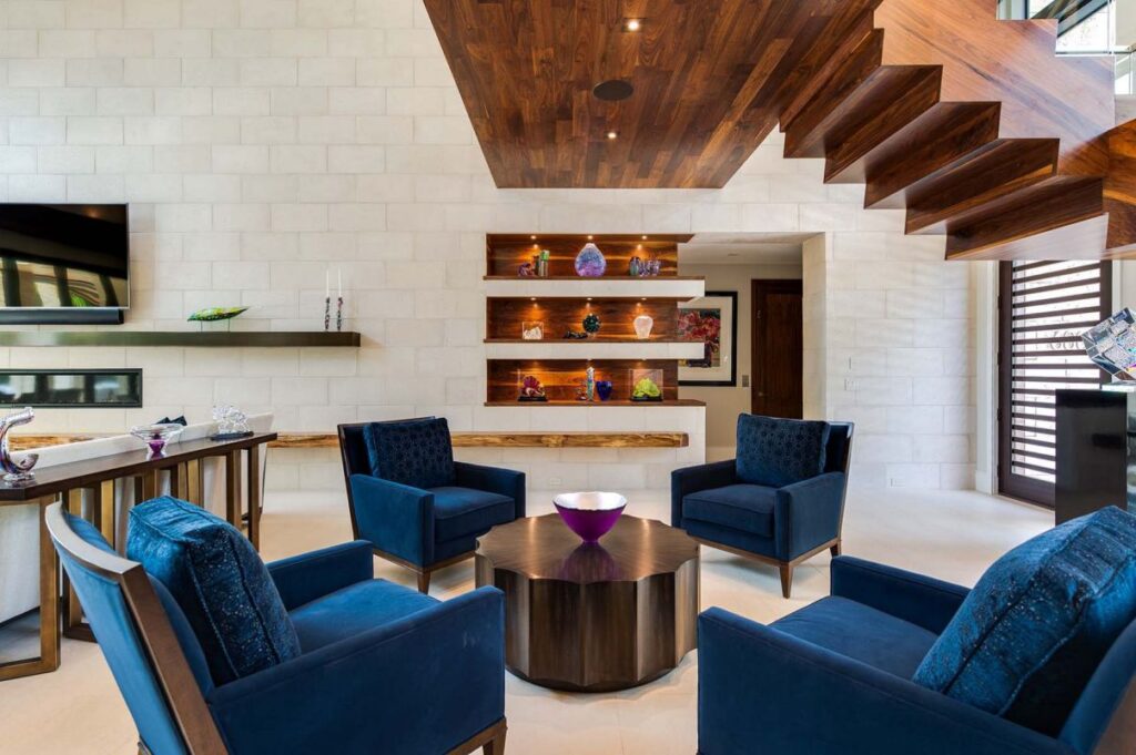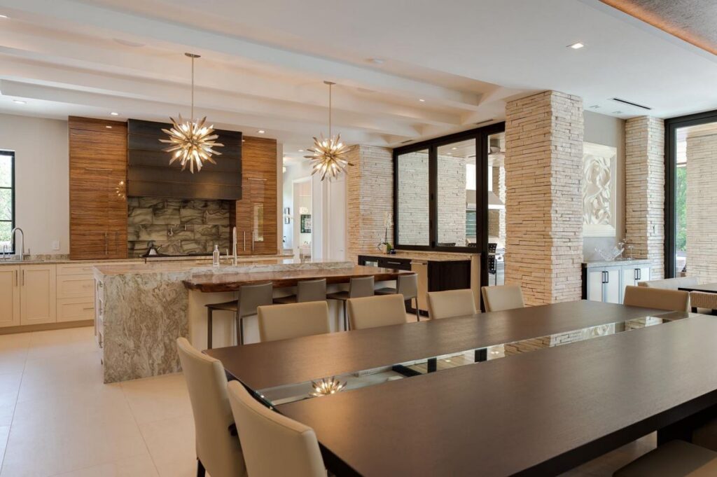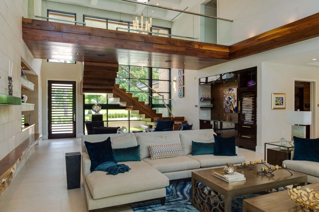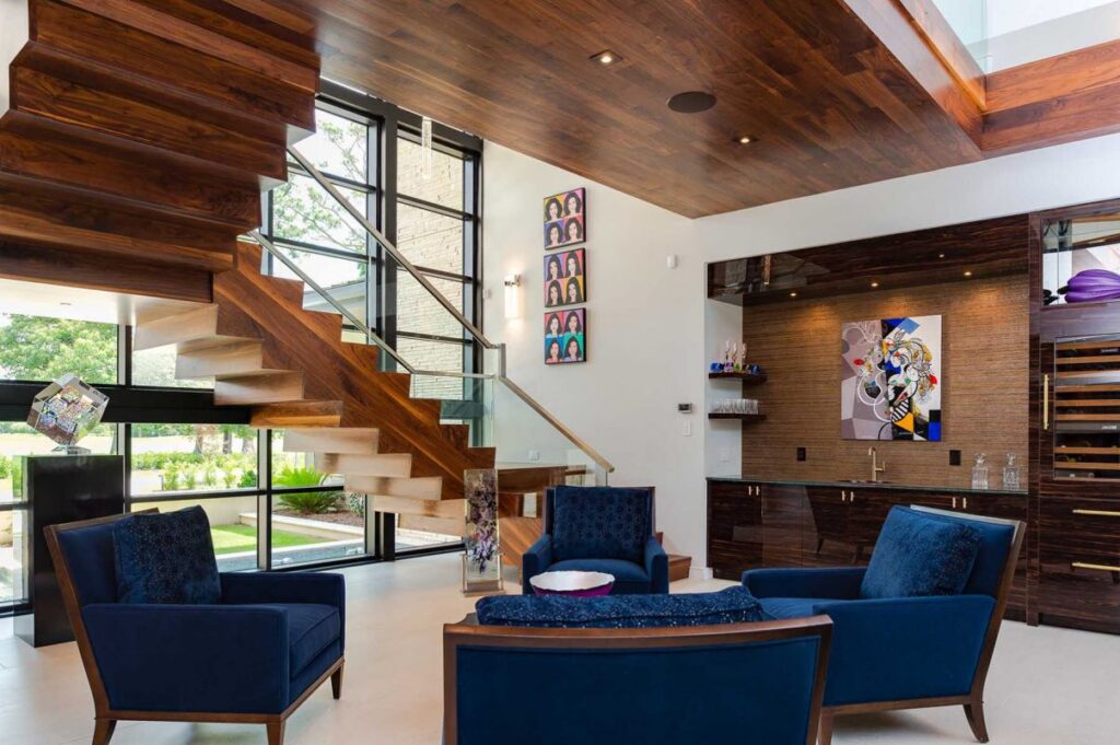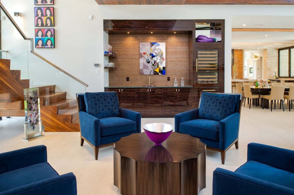 The home’s design grew organically by the crossing of water, influenced by a nearby bridge linking the tree-lined property to the surrounding golf course. The design was also inspired by the Mid-Century architecture of Florida’s Golden Beach and the revival of the idioms associated with that movement. An open stair floats to a second floor catwalk that links north and south bedroom wings, and both contribute to the soaring volume of the interior spaces. Full-length windows double as folding partition doors and when peeled back, open the living room to the lanai, and pool deck while simultaneously providing a bridge between indoor and outdoor living.