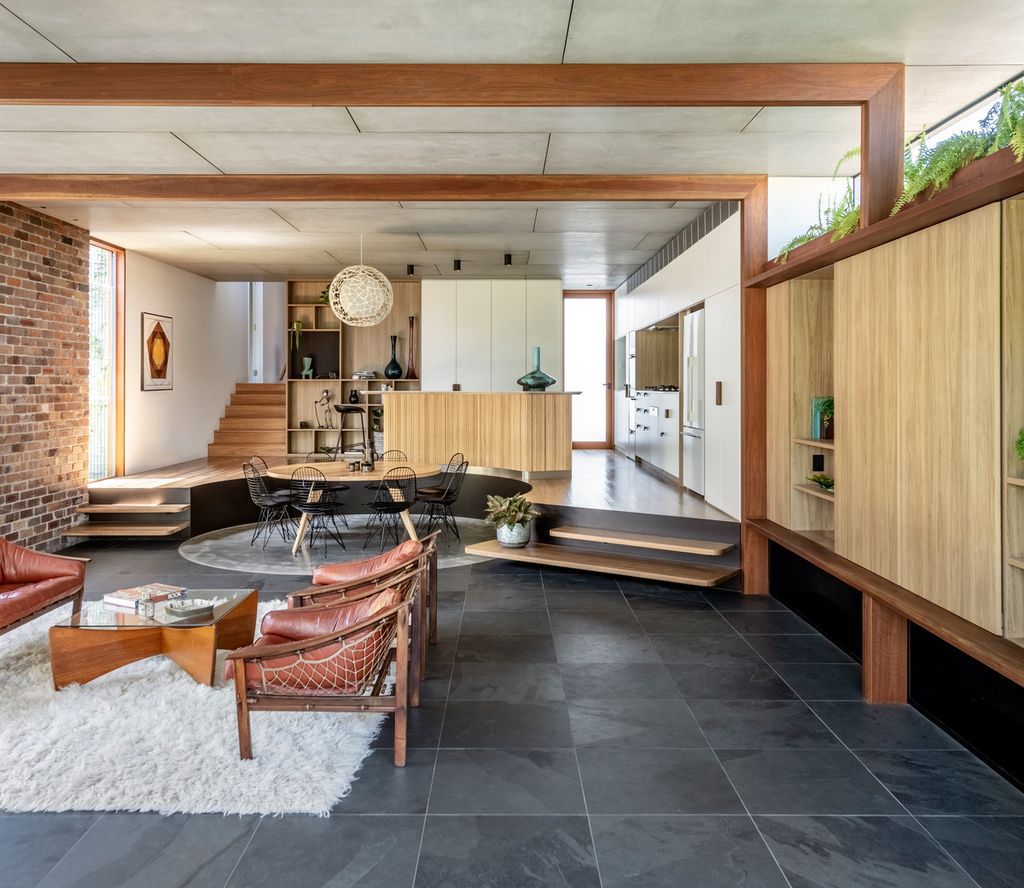 Besides, careful consideration in terms of material use is evident throughout this house. Collaboration with a furniture stylist and vintage supplier enabled the Mid Century aesthetic of the new interior spaces to be accentuated. The materials are also reused to their full potential. As well as, the design supports the family’s sustainable lifestyle through the installation of a 3kW photovoltaic system and an 8000L rainwater tank to reduce the environmental impact of day to day life.